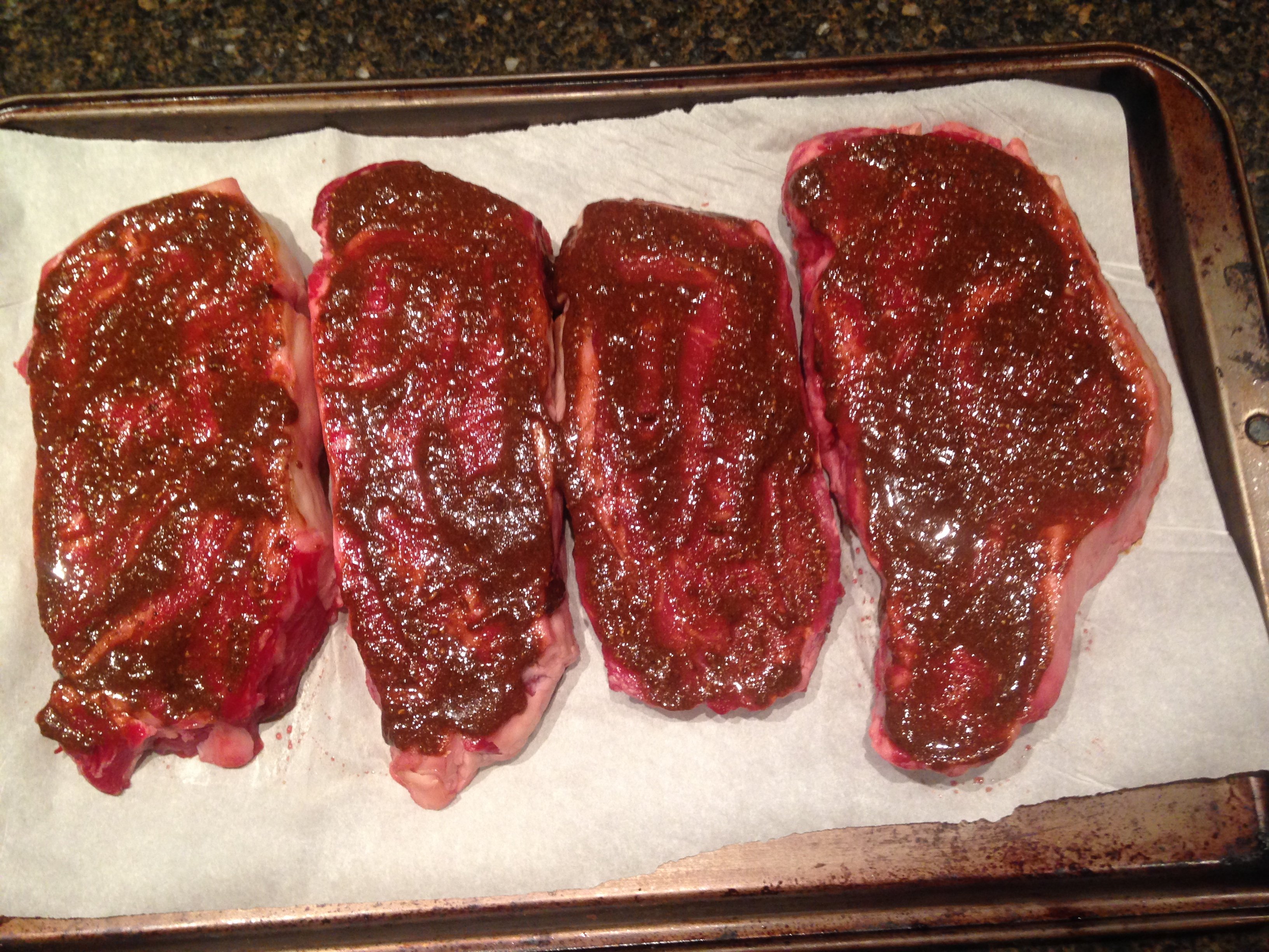 Steaks were generously slathered and into individual vacuum bags for an overnight marinate.