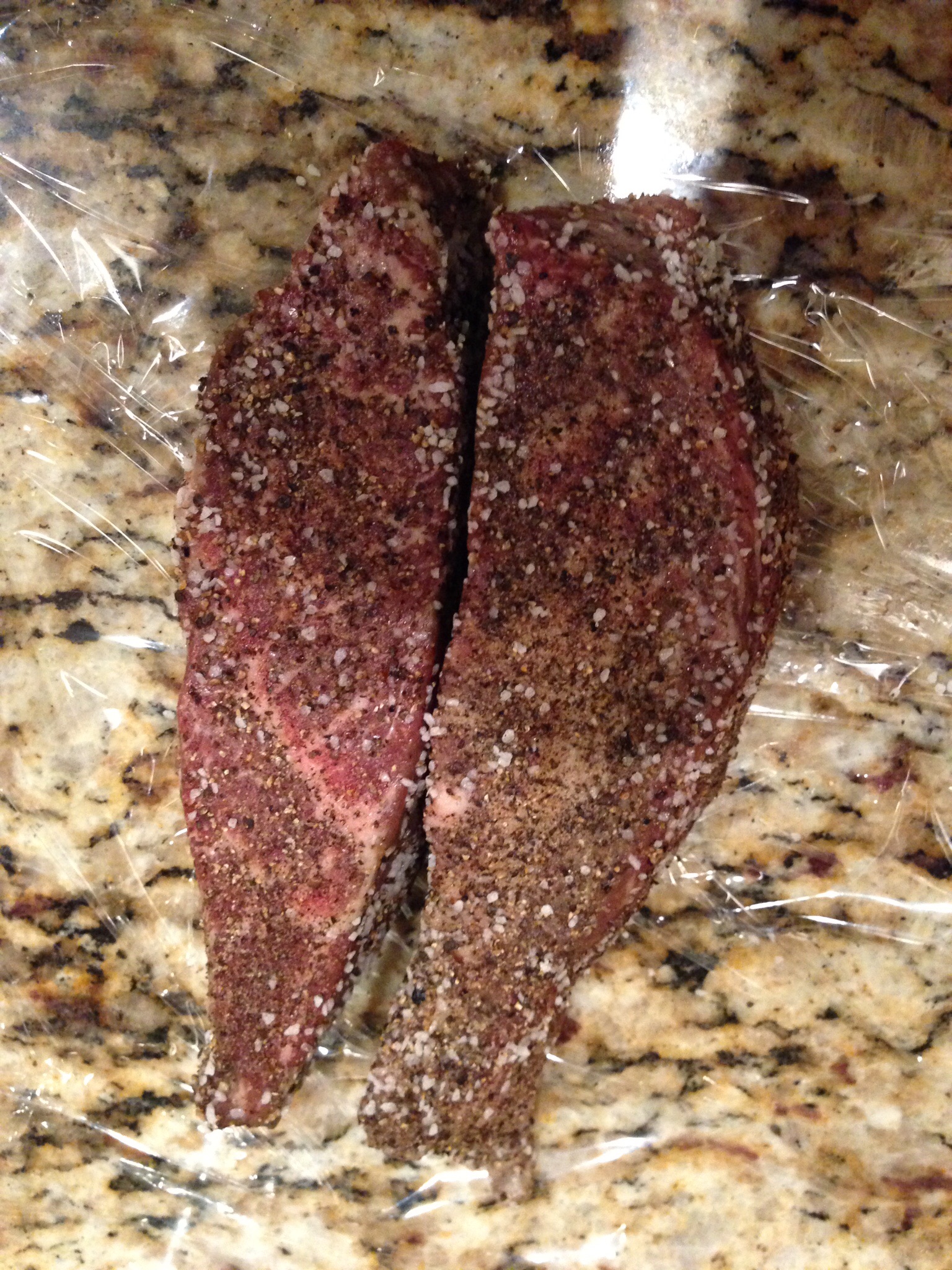Getting ready for cooking tomorrow. I am going to spatchcock two chickens for my lunches next week and then ramp up the temp and grill some steaks. The chickens are bathing and half the steaks are marinating in allegro and the others are rubbed with fresh ground pepper and kosher salt. My kids love the allegro and I wanted some simple rubbed steaks to taste the flavor of the eggs with steaks.