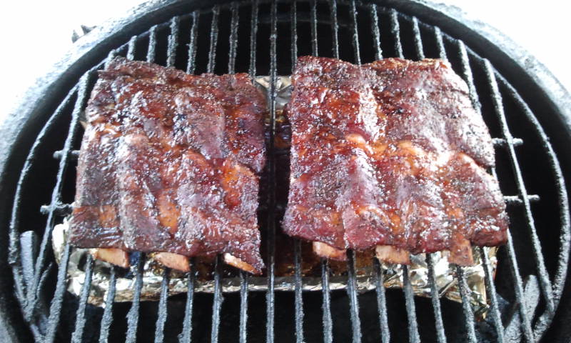 Ever since I took a class on competition BBQ, I have been subscribing to the method of PS legs up, and a substantial water bath (2.5 liters) underneath. I had already seasoned and slathered the bottom of the rib racks and placed them on the grate.