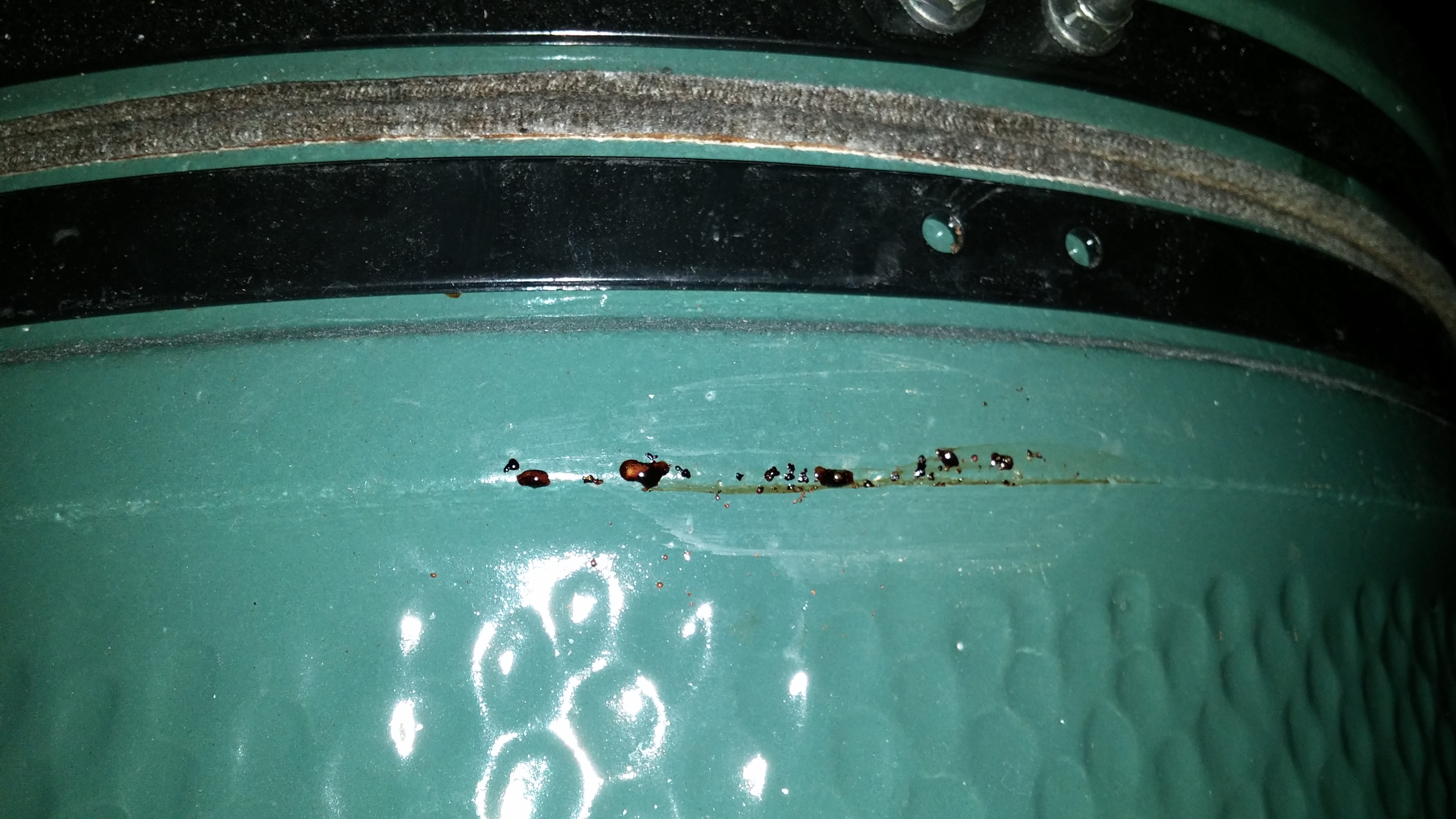 Ever seen anything like this?? Just finished an 18 hr butt cook at 225-50 and jacked it up to 550-600 for it's first ever clean. Egg is about 3 months old, maybe 15 cooks deep, only low n slows. This is the first time the temp has been above 350. Heard a faint tea kettle type of noise and finally to my surprise spotted a little bit of this smokey smelling crap seeping out of the front of the body. Then I peeked around and saw pic number 2. What gives? Should I be worried?