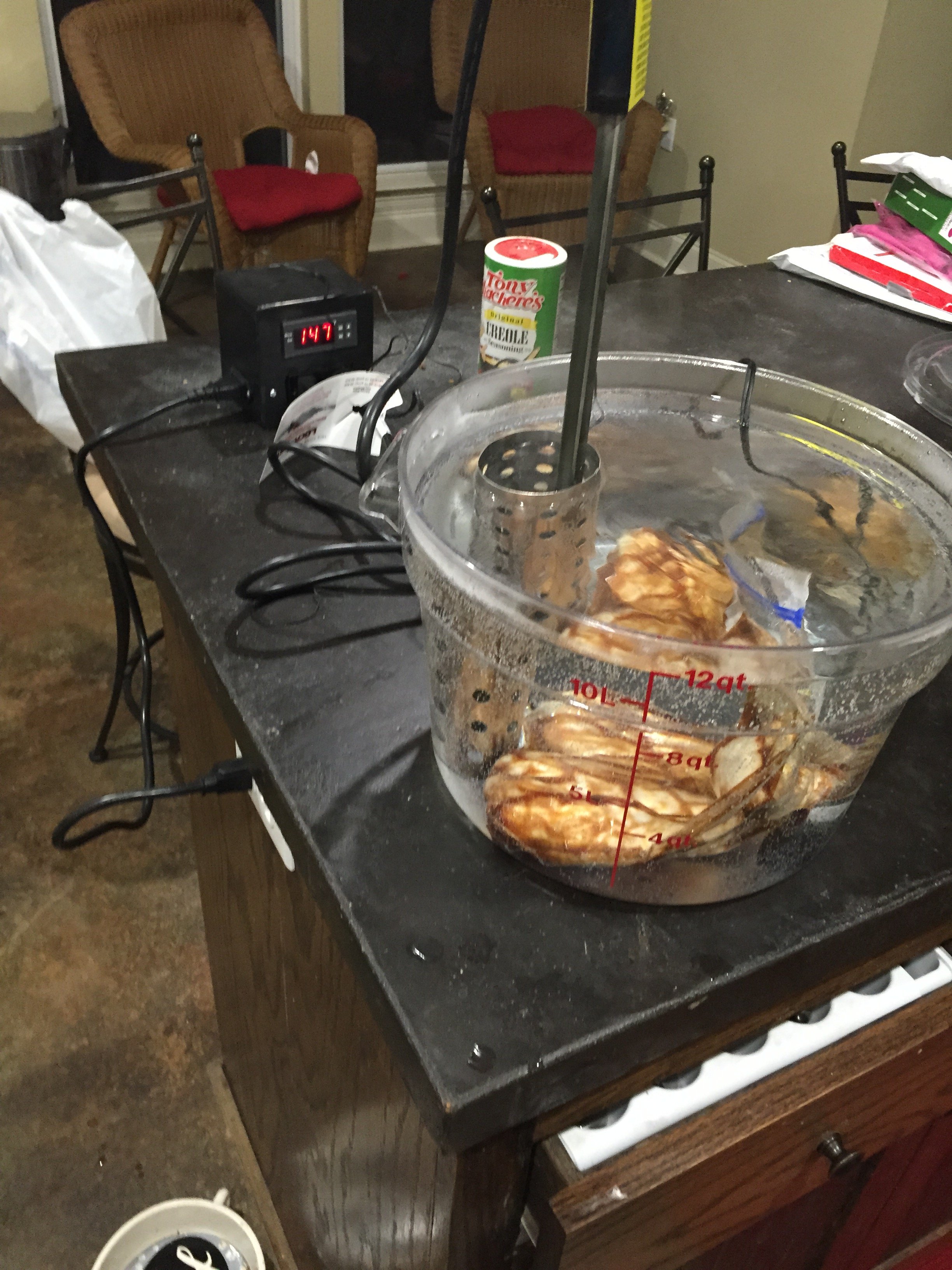 I dont remember who on here to give the credit too, but thanks for showing us this meal. I built a DIY sous vide cooker using a temperature controller and my rice cooker and it works nicely. I put 4 breast in a ziploc with a little EVOO, garlic, salt, and pepper, placed in cooker for 1 hour and 20 minutes at 149 degrees. While this was going on I used the wok to stir fry some 'sparagus and warmed up the egg with some Italian sausage. When chicken was done it looked good enough to eat but I heated up my salt blocks to 600+ degrees and seared both sides while melting a little fresh mozzarella on top, with a pinch of basil. A touch of marinara and it was a great meal with Caesar salad. So thanks again for the recipe.