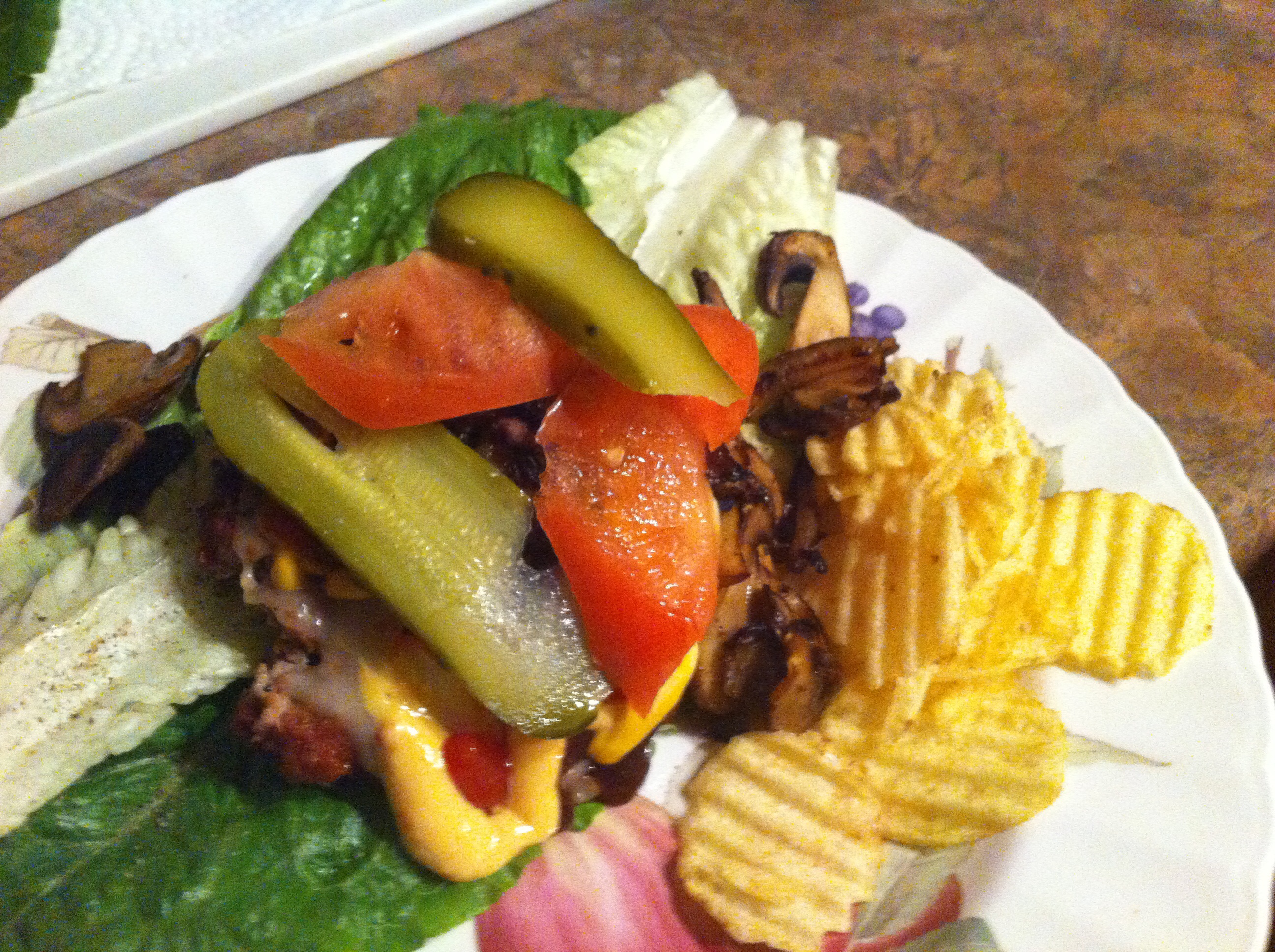 Grilled burgers, direct @400.melted some provolone on the burgers. Off the grill and onto lettuce. Buried the burger with mushrooms,tomatoes, and pickles. Couldn't see the burger but it was there. Kind of crappy plate shot. Tasted great.
