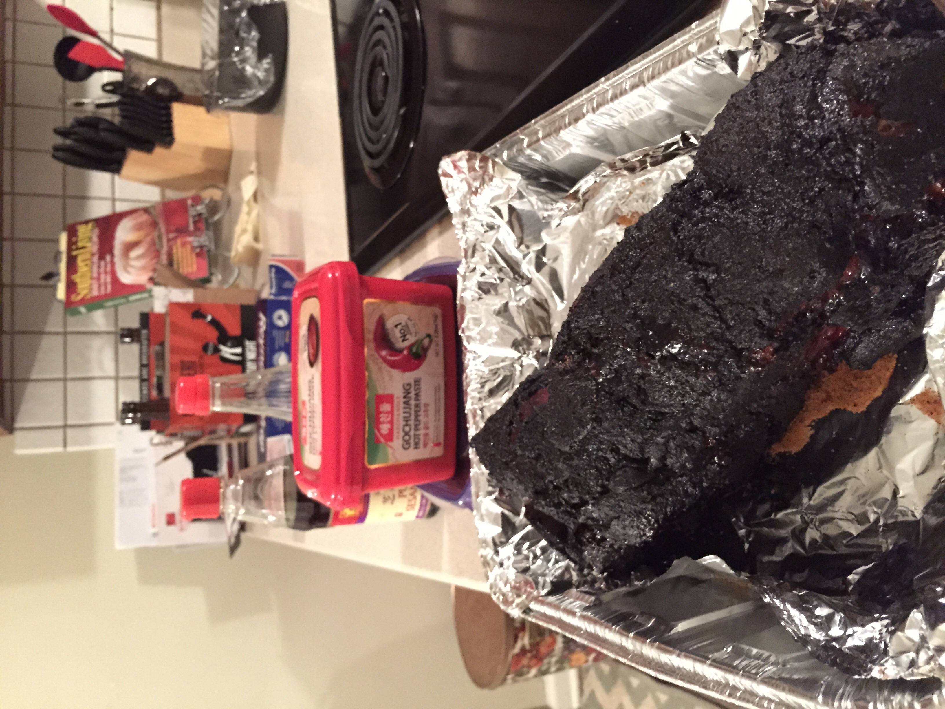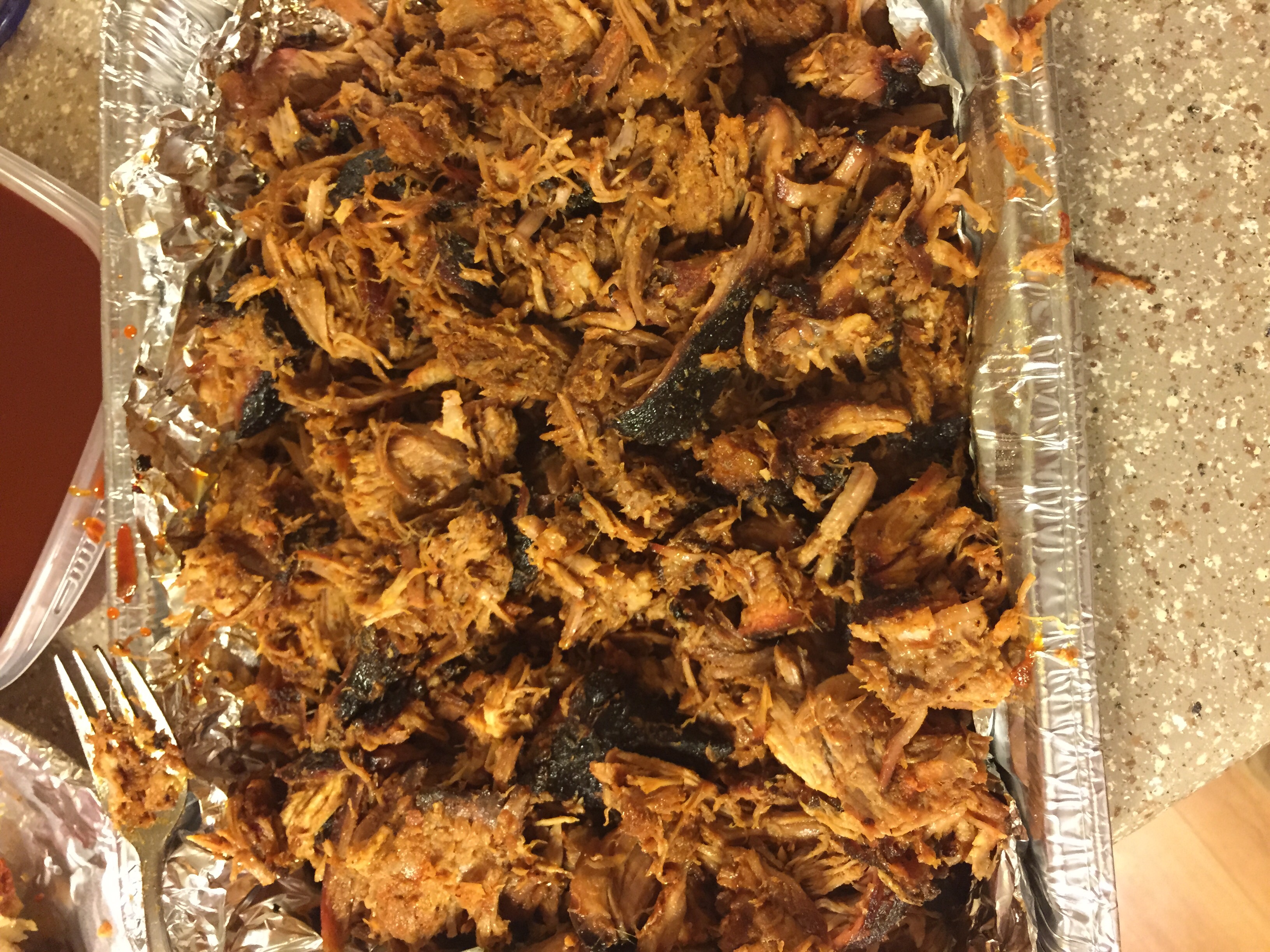 Made the Heirloom BBQ (Atlanta) sauce recipe and used it to inject a 5lb bone in Boston butt. Rubbed with some of the leftover gochugang paste and olive oil. Patted down with Georgia butt rub (forget the brand). Did all