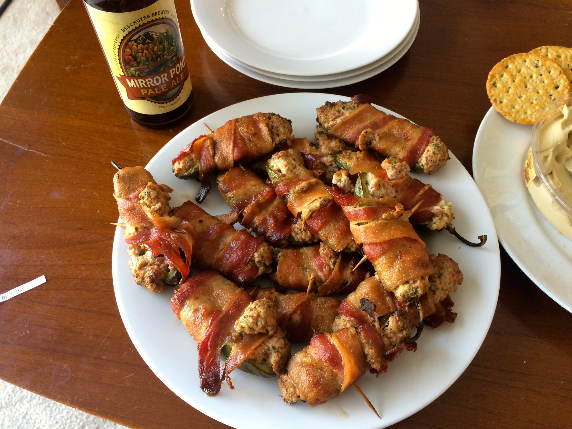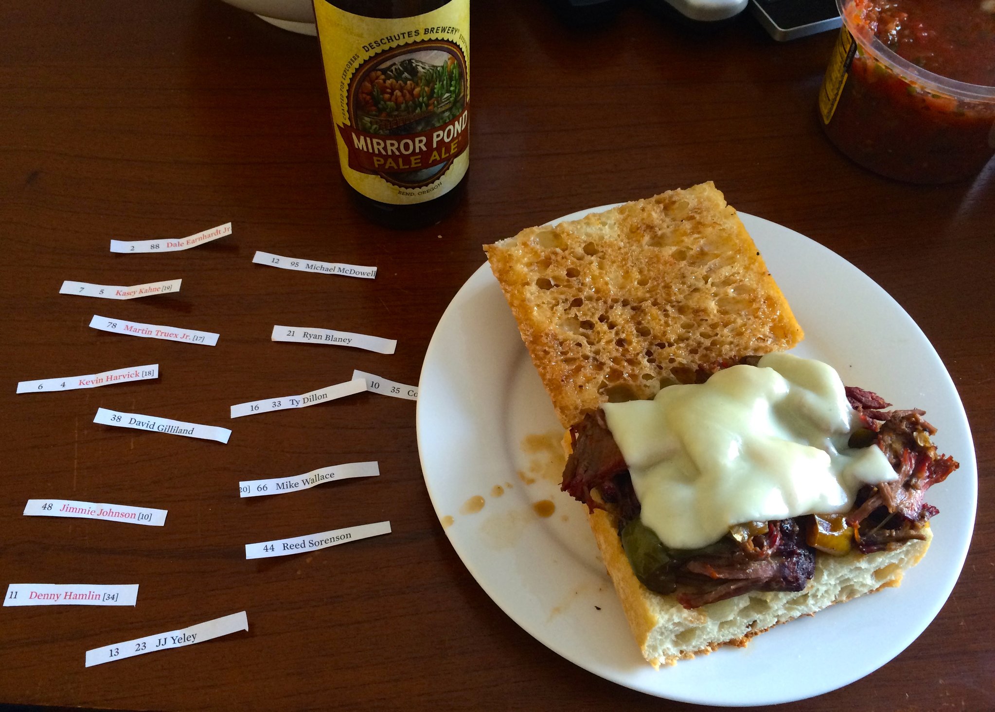 I had a couple guys over to watch the Daytona 500 today and I tried to provide a nice sampling of BGE food. I provided some ABT's as an appetizer, Pepper Stout Beef Sandwiches (as recommended by @jcaspary ), Crazy Bread and Mrs. Squeeze's Chocolate Chip Kahlua Cake. Everything turned out amazing.