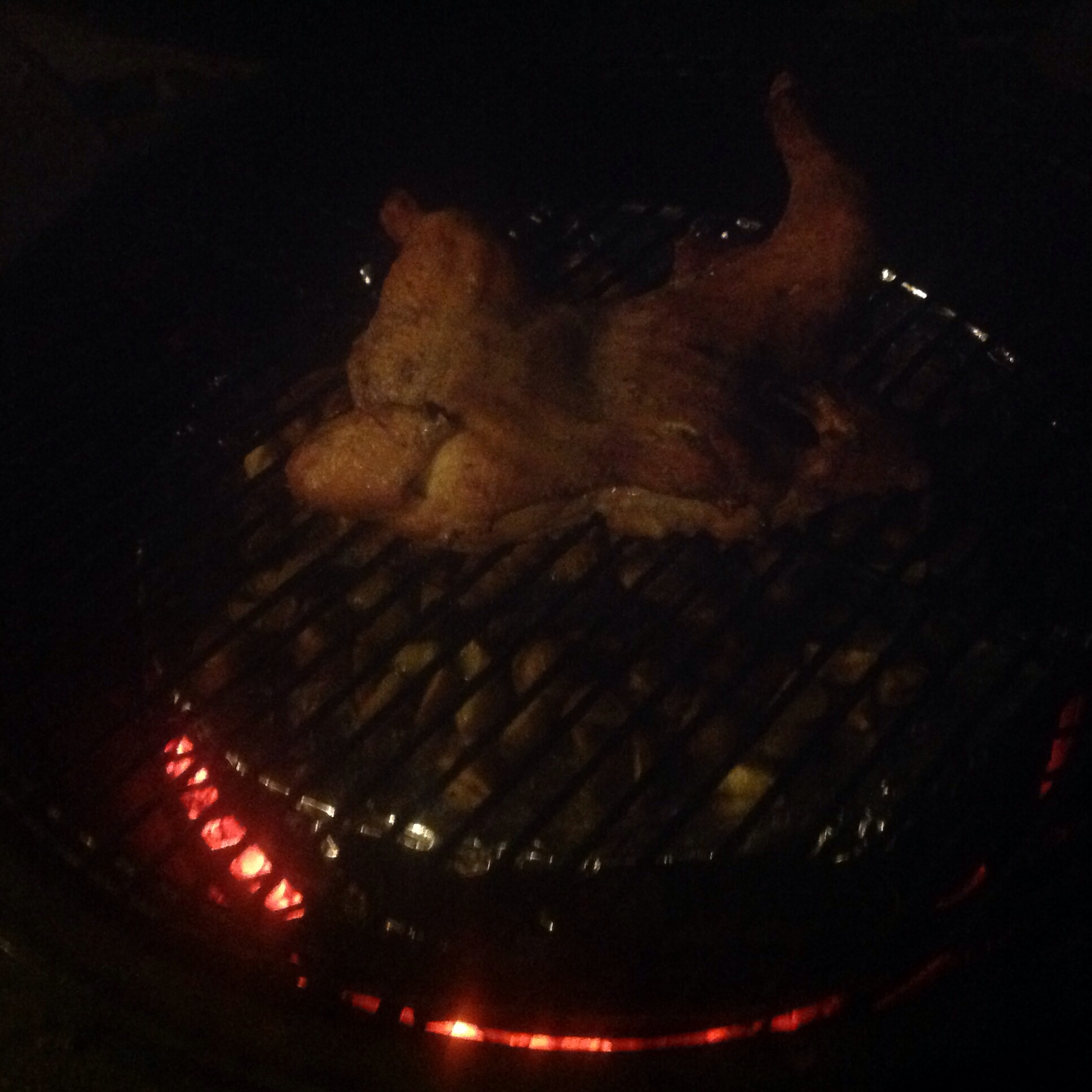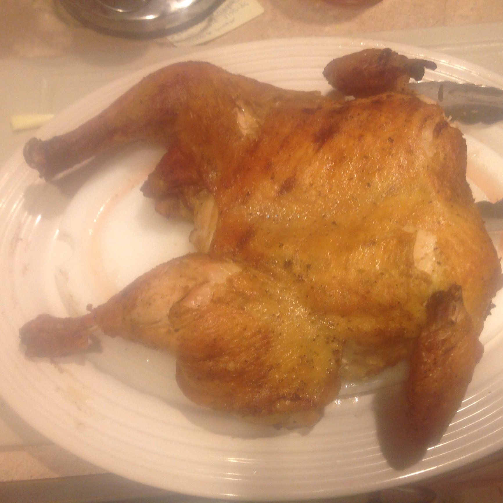 Lit the XL with the remaining fogo from my last beef rib cook. Put in a foiled ceramic stone for indirect. (My PS broke, and as I bought the egg as a demo at the PNW Eggfest directly from the distributor, I don't really have a "dealer", so not sure how to go about getting it replaced.) Foiled bricks on top of that for some spacing, then put on a pan of quartered baby gold potatoes that I'd sprinkled with kosher salt, pepper, some fresh rosemary, peeled garlic cloves, and some EVOO. Next rack was the chicken. Simple spatch, dried off, dusted with baking powder and Greek seasoning. 15 minutes skin side down and then the flip. Ran at about 375 until the chicken read 140 in the thigh. Took off the taters, which were nice and soft but not as browned with yummy goodness as I wanted. Opened up the egg to let the chicken finish cooking while crimping the skin. Finished the taters under the convection broiler for a few minutes. Decided the rosemary could count as the veggie for the night.