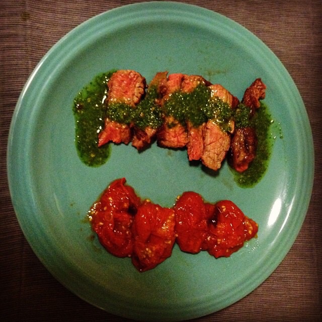 Main in course was grilled skirt steak with chimichurri sauce. Highly recommended! Had the BGE at about 600 and hit the steak about 3 minutes on either side. Had a little medium for the wife and a lot of medium rare for me. Wife roasted some tomatoes on the side to finish it off.