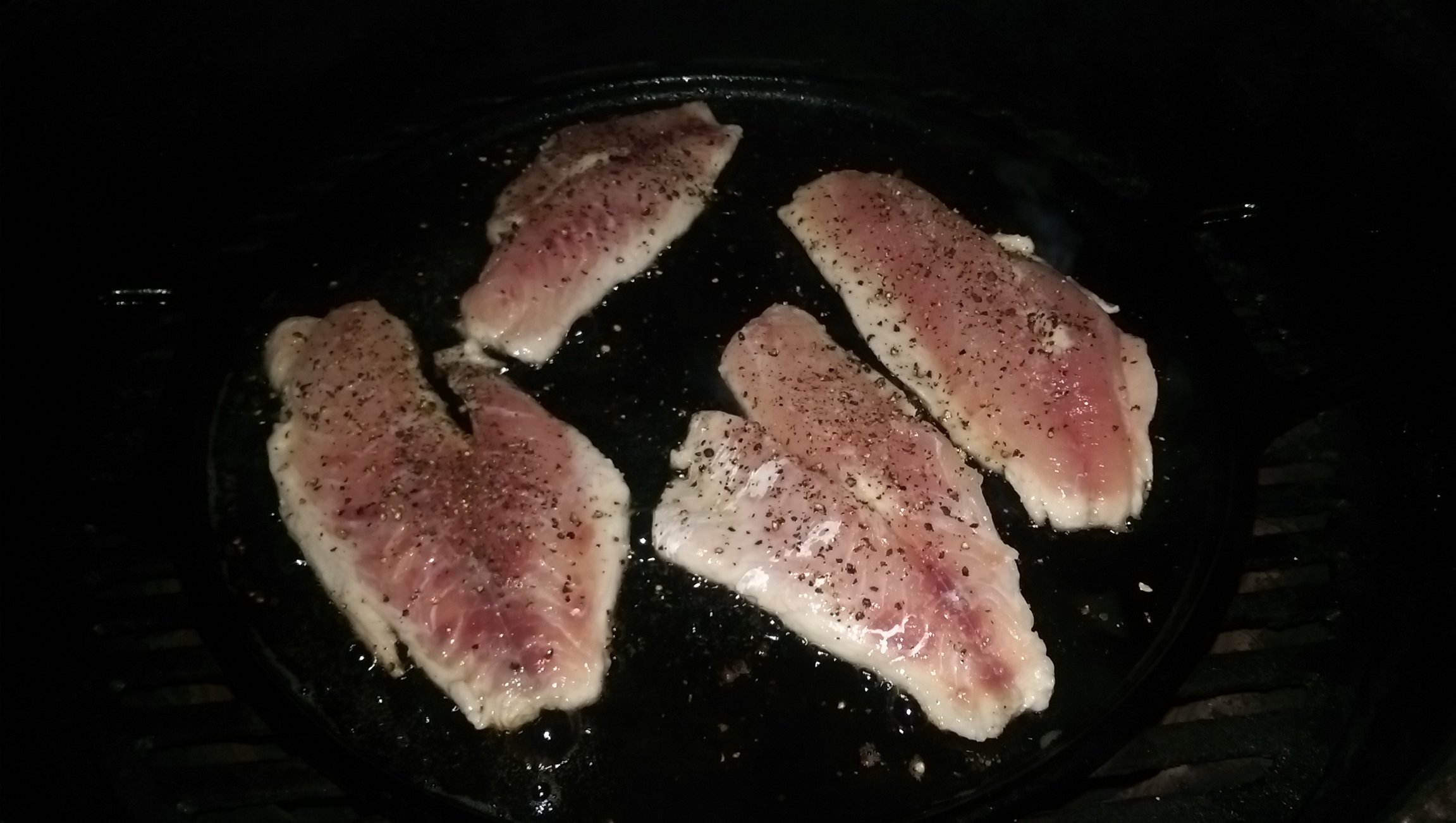 While that was going got the Pink Snapper fillets going. S&P only and butter in the CI pan. Cooked at 400℉ direct on a CI pan in the large. Cooked till flaky.