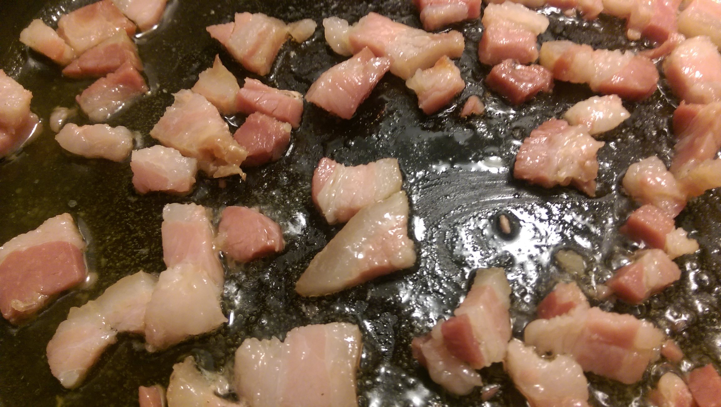 Then the pancetta to melt out a little for flavor. Note @HuskerMaMa made the Spaghetti alla Carbonara and the dessert of fresh Raspberries and Whipped kahlua Cream (heavy whipping cream, kahlua liqueur, vanilla extract).