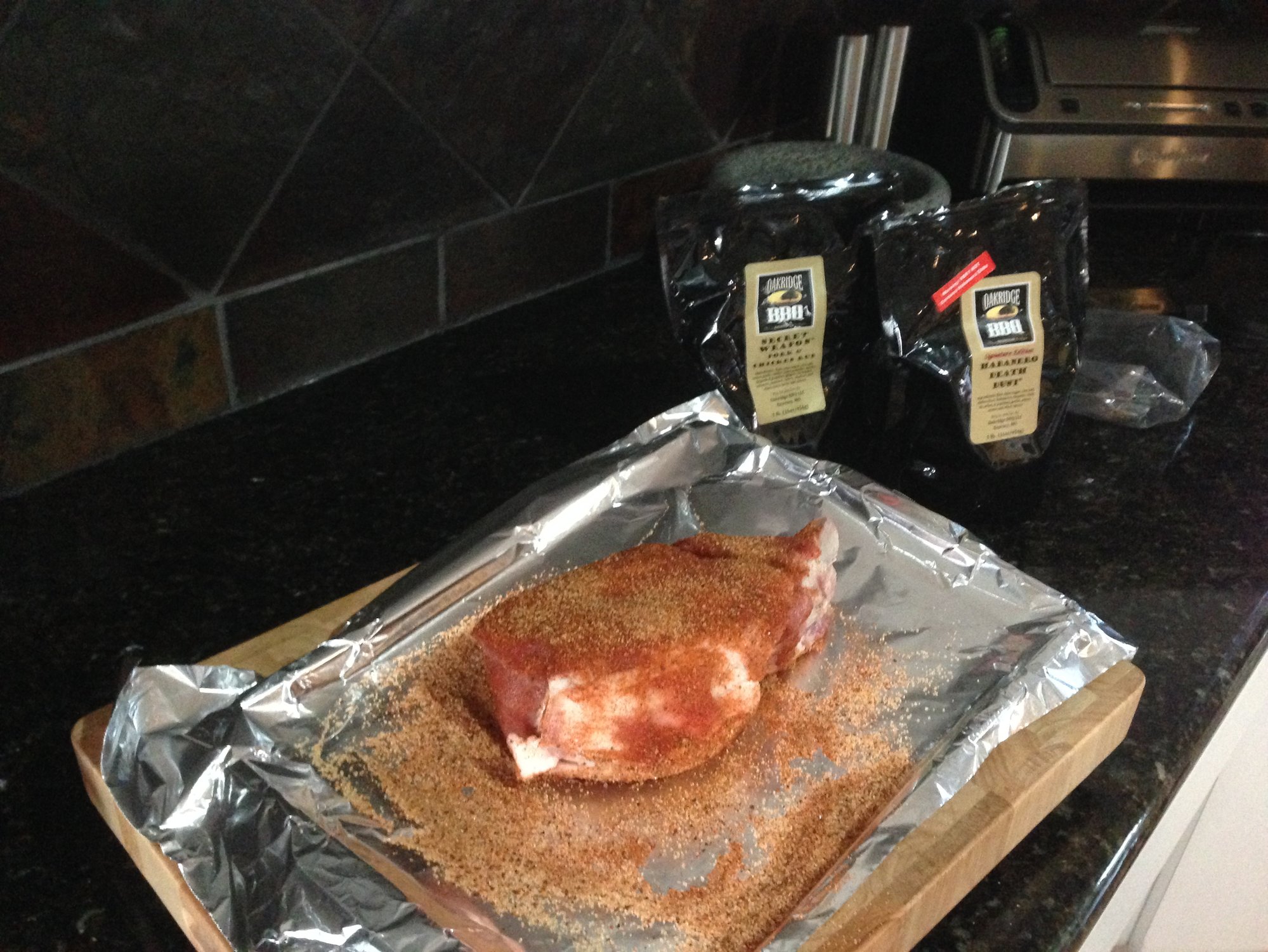 The GFU is heading out of town tomorrow, so thought I'd send her off with a pork rib roast. My ulterior motive was to build some chile verde with the leftovers. These standing Pork Rib Roasts are available at Costco from late November thru the end of the year. 3 months later, it was every bit as good as when it went in the freezer - thanks FoodSaver, I seasoned the 2 rib portion with Oakridge BBQ Secret Weapon, and some Habanero Death Dust. On the medium direct at 350 for just over 45 minutes, turning half way through. It was GREAT!!! Unfortunately there were no leftovers - we polished it all off.