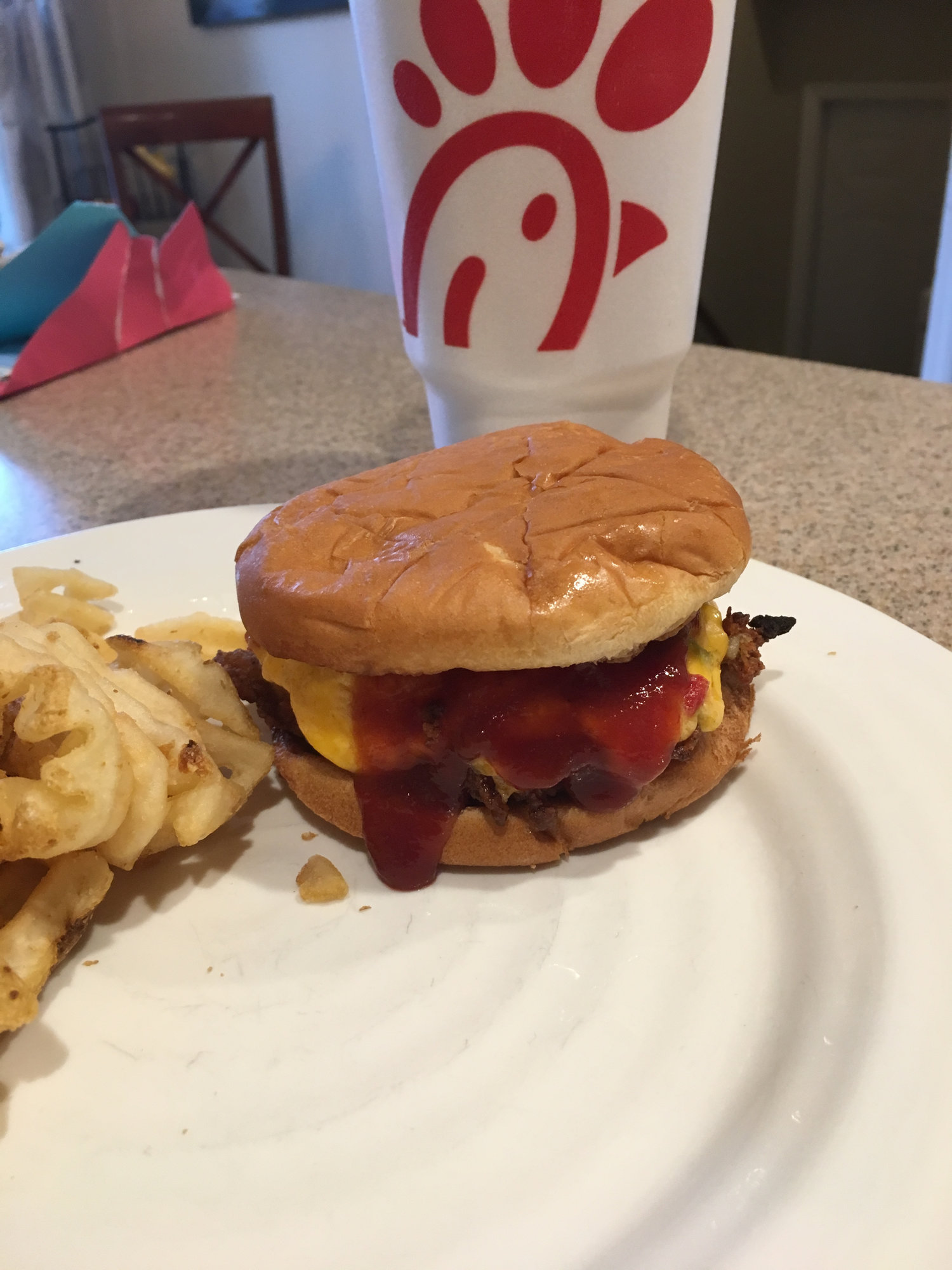 Post birthday night lunch. Toasted jalapeno pimento cheese and bbq sauce on a Chick-fil-A sandwich.