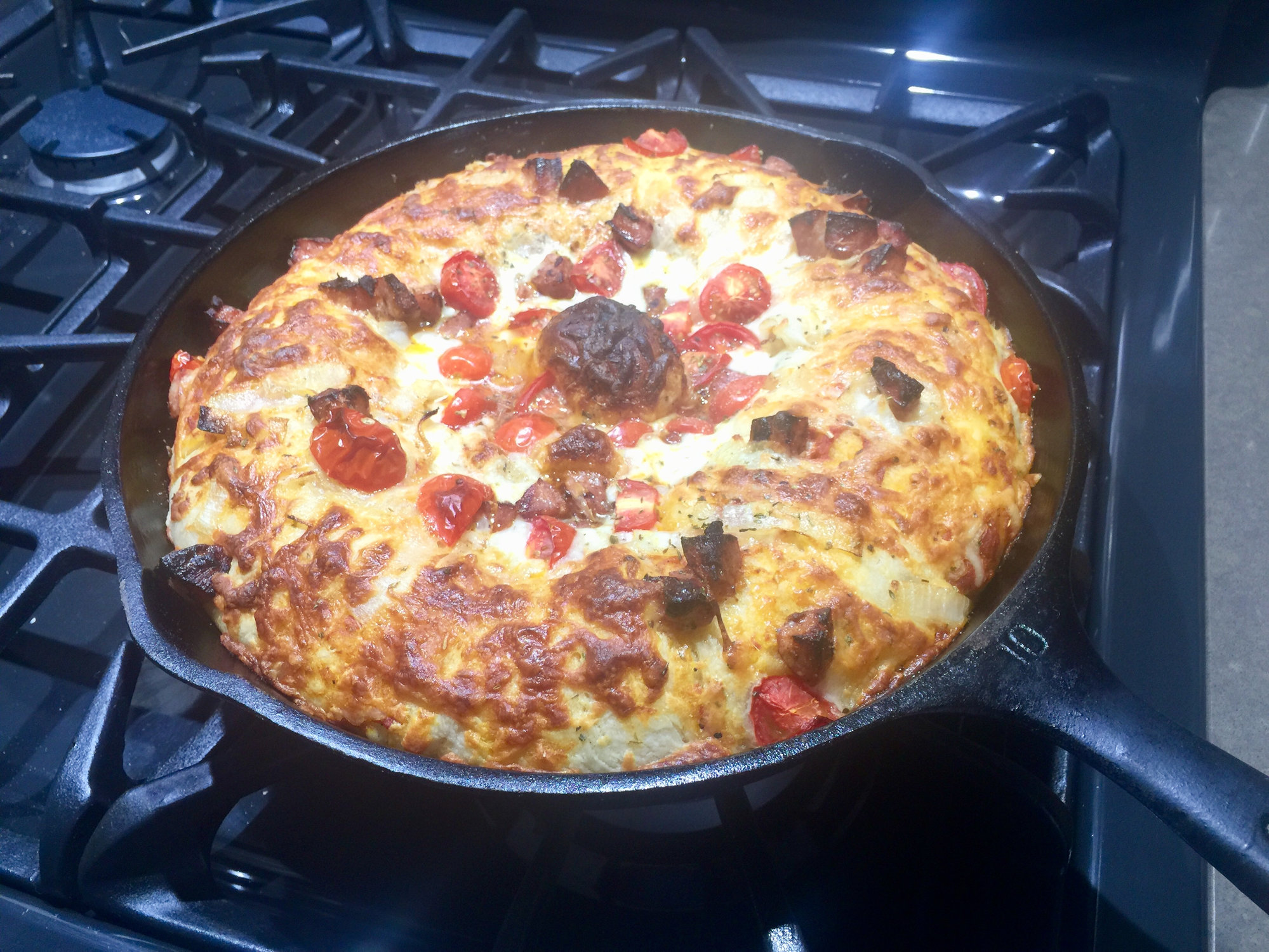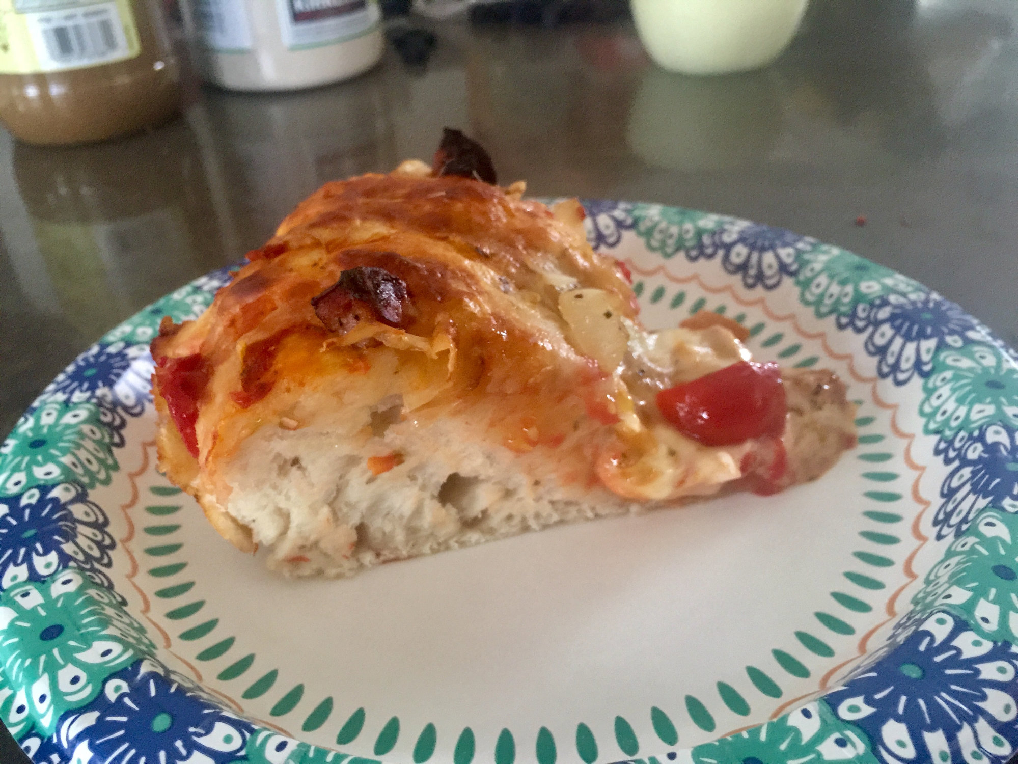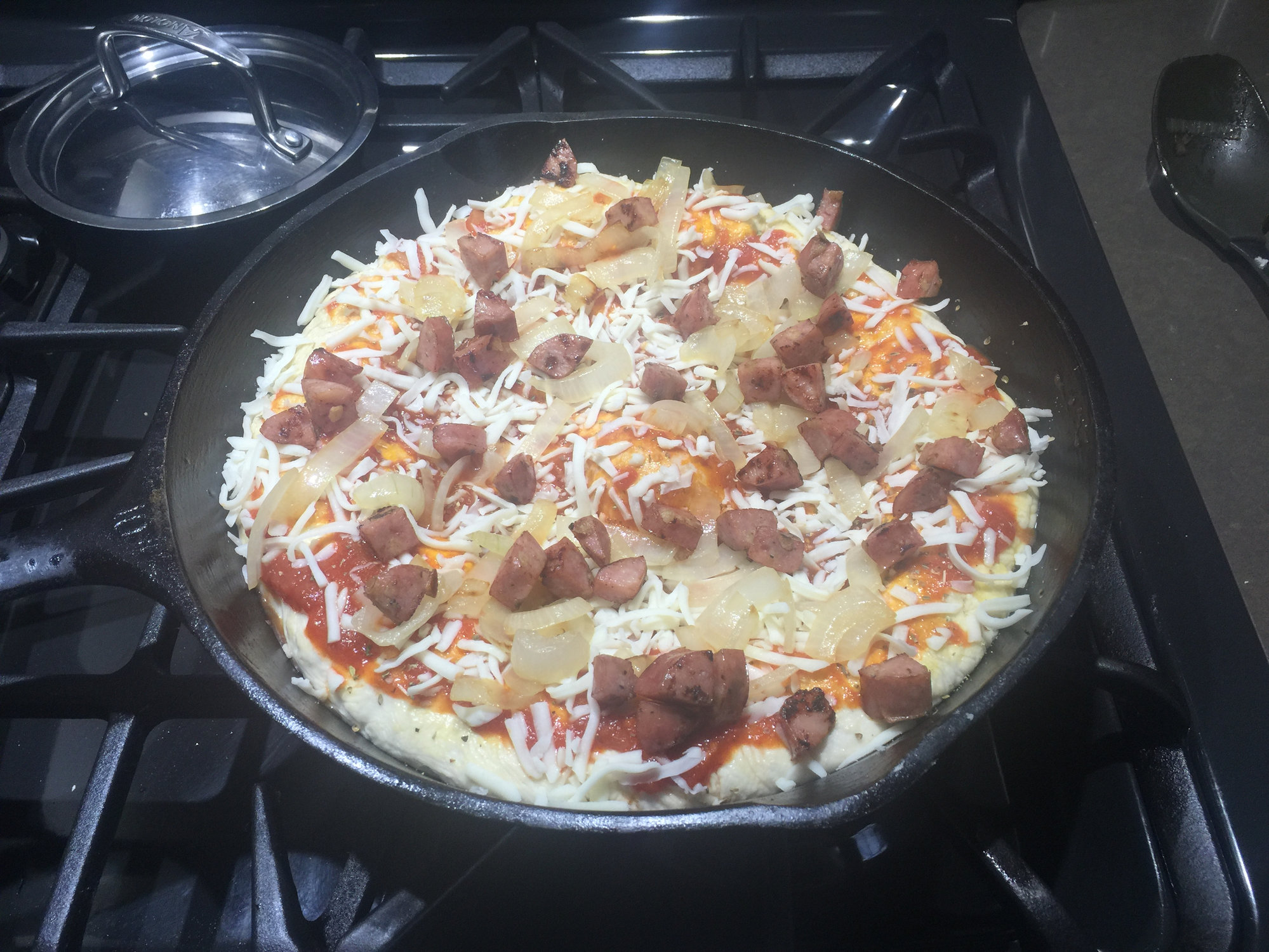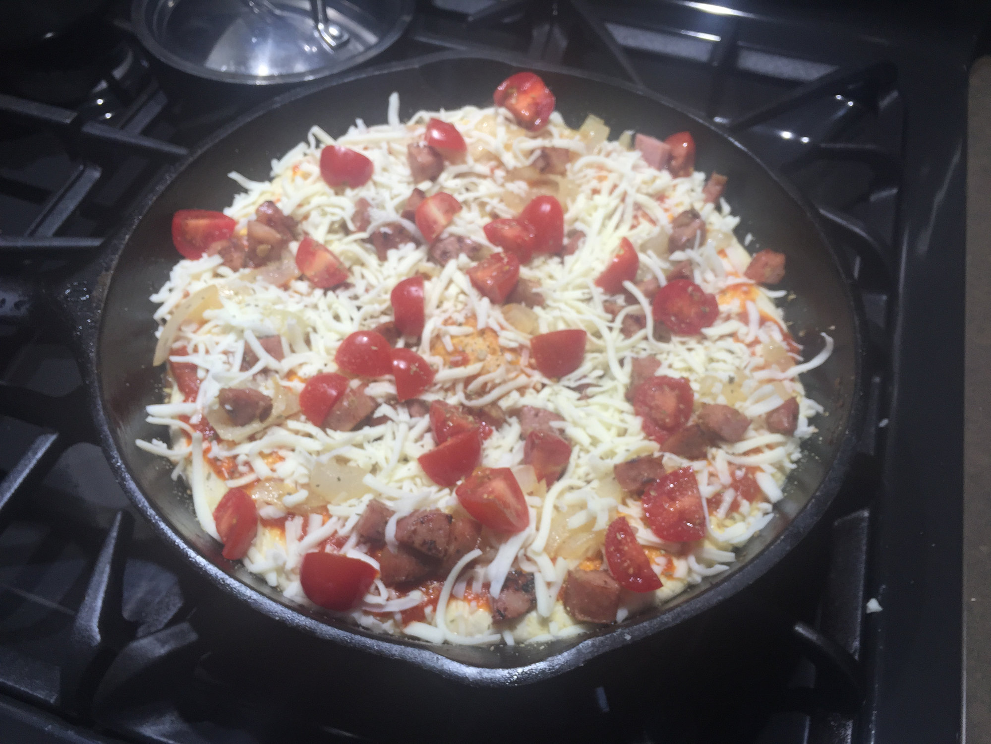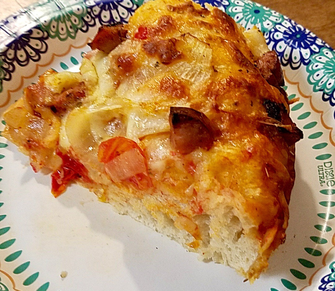 Bread in a pan with pizza toppings. Next time I will use a 250g dough ball for my pan pizza.