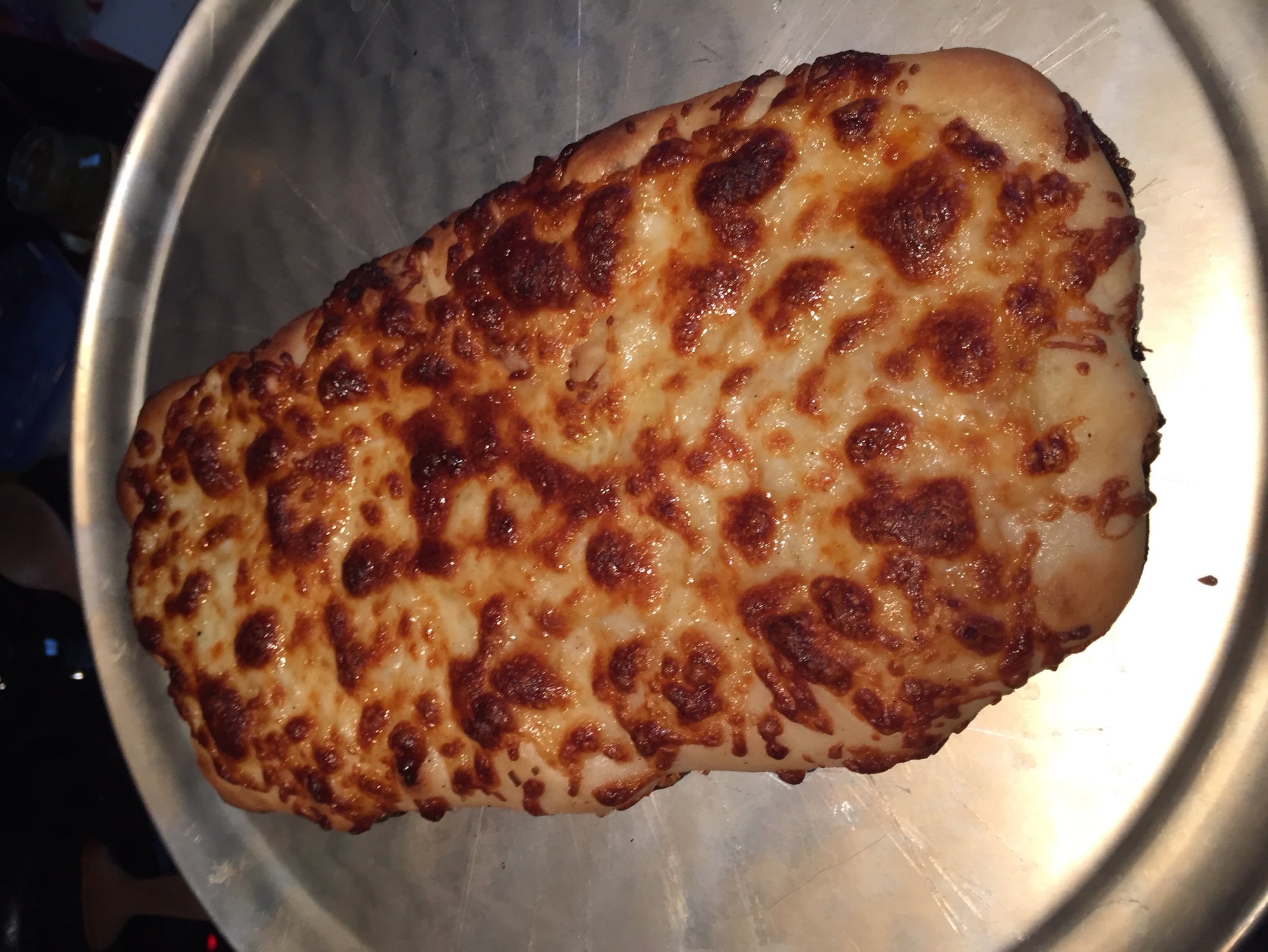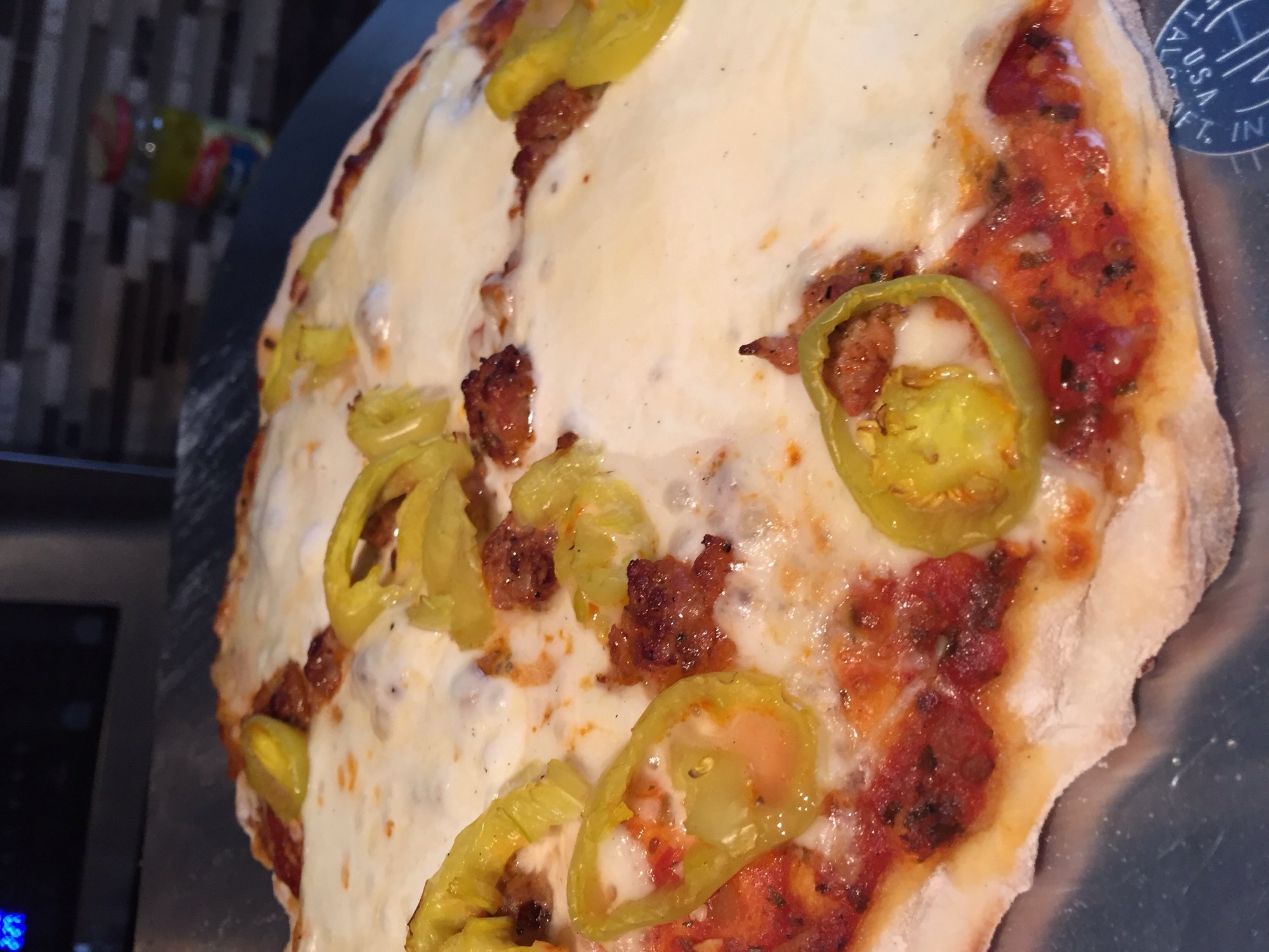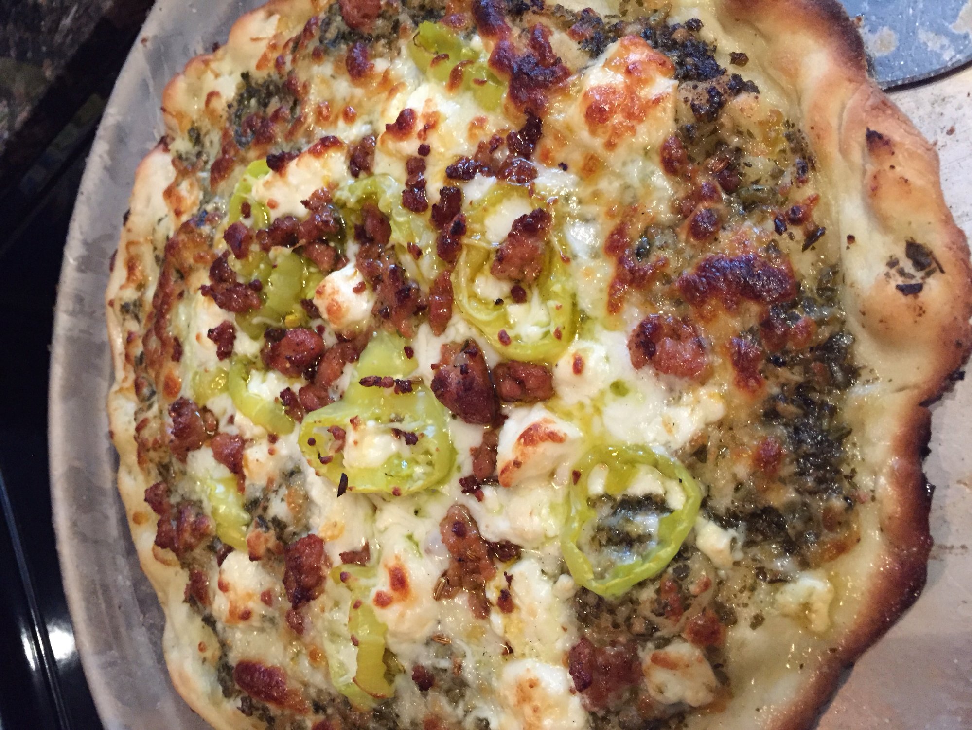 started with sautéed garlic and evoo with shredded mozz and parm for the garlic bread. Just used the pizza dough but kept it thicker. Wife pizza with pesto, feta, spicy Italian sausage, mozz and parm mix and banana peppers. Mine with homemade chunky tomato sauce, spicy sausage, fresh mozz, shredded parm and banana peppers.