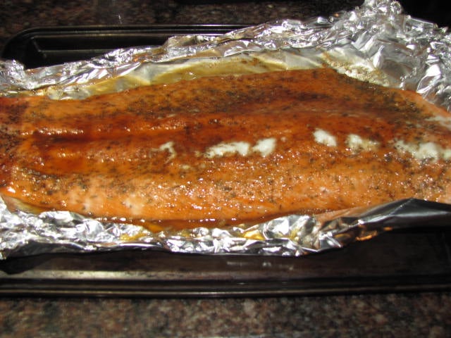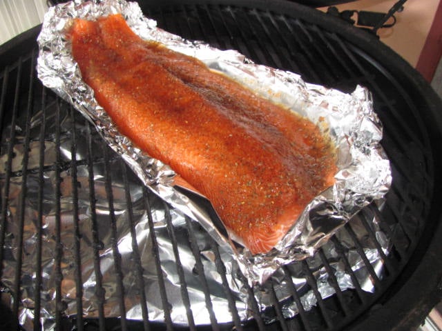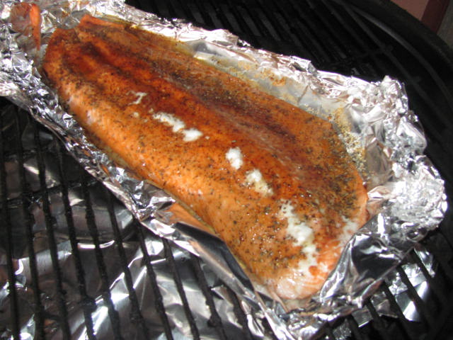 Salmon filet, my brown sugar rub, three tablespoons of Jamenson, indirect at 300 for about 30 minutes until the albumen started to leak out. Very soft, slightly sweet, nice gentle treatment for salmon.