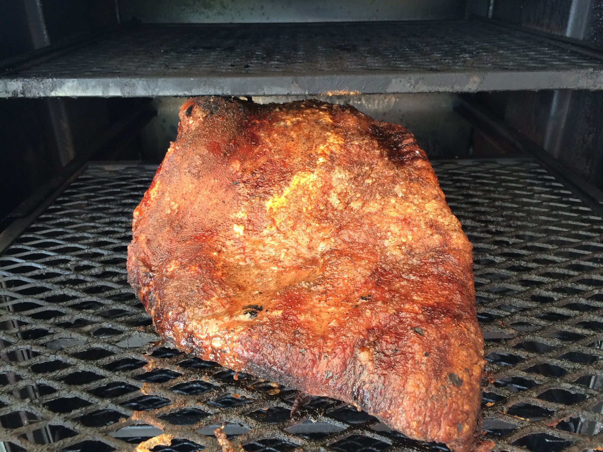 Here is a 23.8 pound Waygu Gold Grade that will get wrapped with paper when it's ready. Here is a shot my youngest son sent me at exactly the 5 hour mark cooking at 225 degrees over very heavy water oak for smoke.