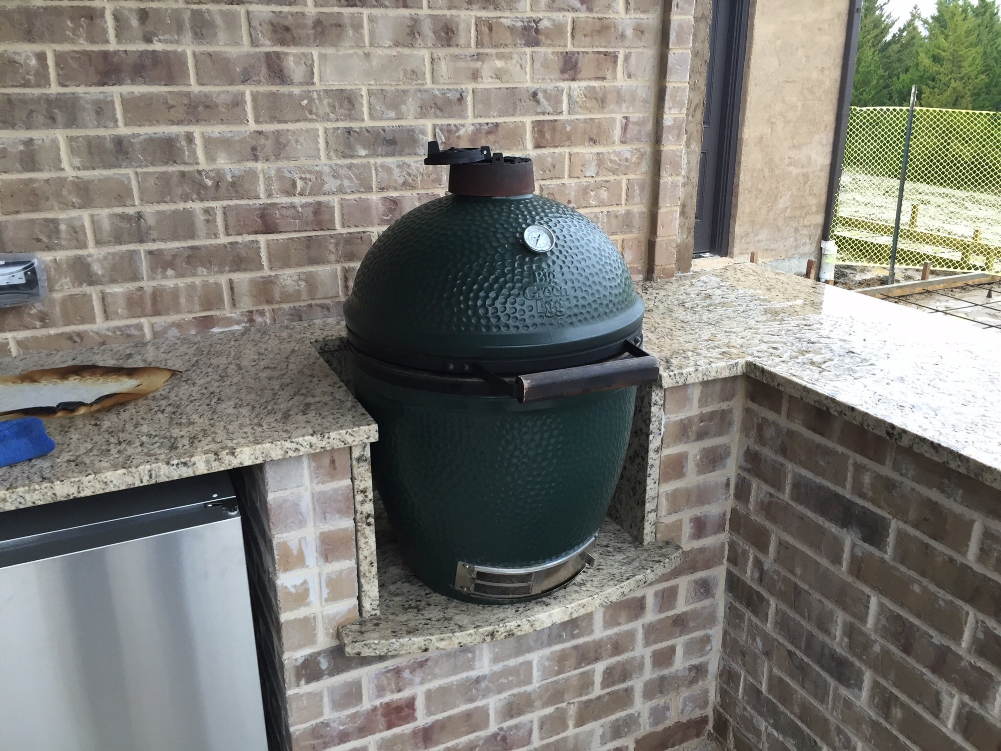 Love the non-flammable egg area. One caution though... I used to have my egg (in a nest) near the house like that, but that meant that the top vent was pointed at the house whenever the dome was open. This directed the smoke right at the siding and before long I noticed a smoke stain on the house. Mine (painted surface) cleaned up pretty easily and then I relocated my egg. Don't know about cleaning brick. Something to keep an eye on.