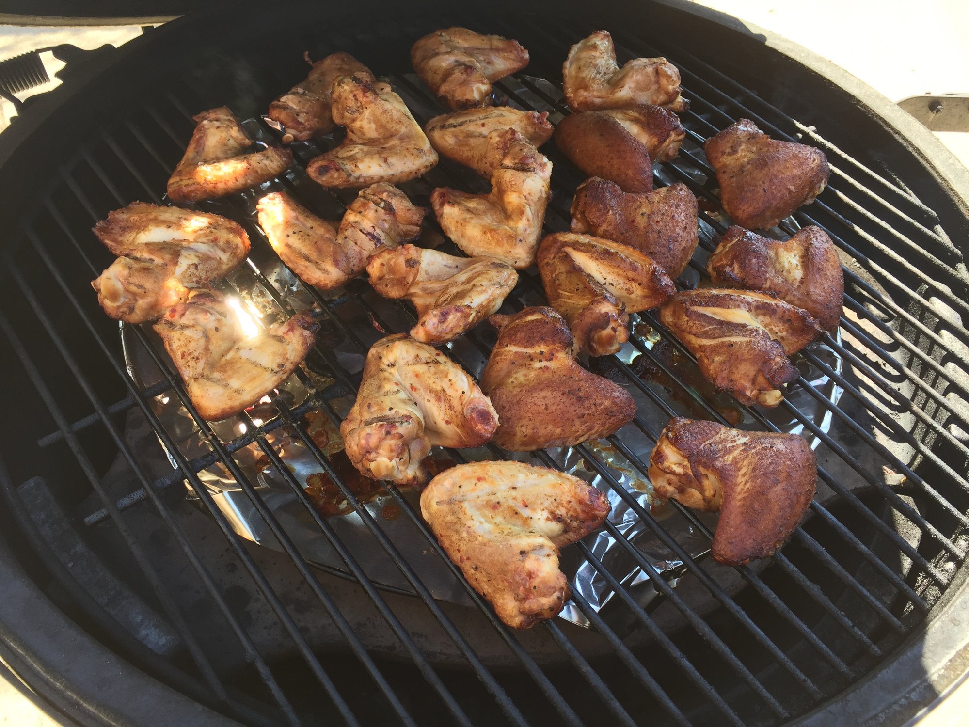 Nothing on them but rub, the wings were right out of the package to which I cut the tips off them and just sprinkled them with rub, platesetter legs up drip pan grate and wings. We really like chicken with cherry wood.Charlotte, Michigan XL BGE