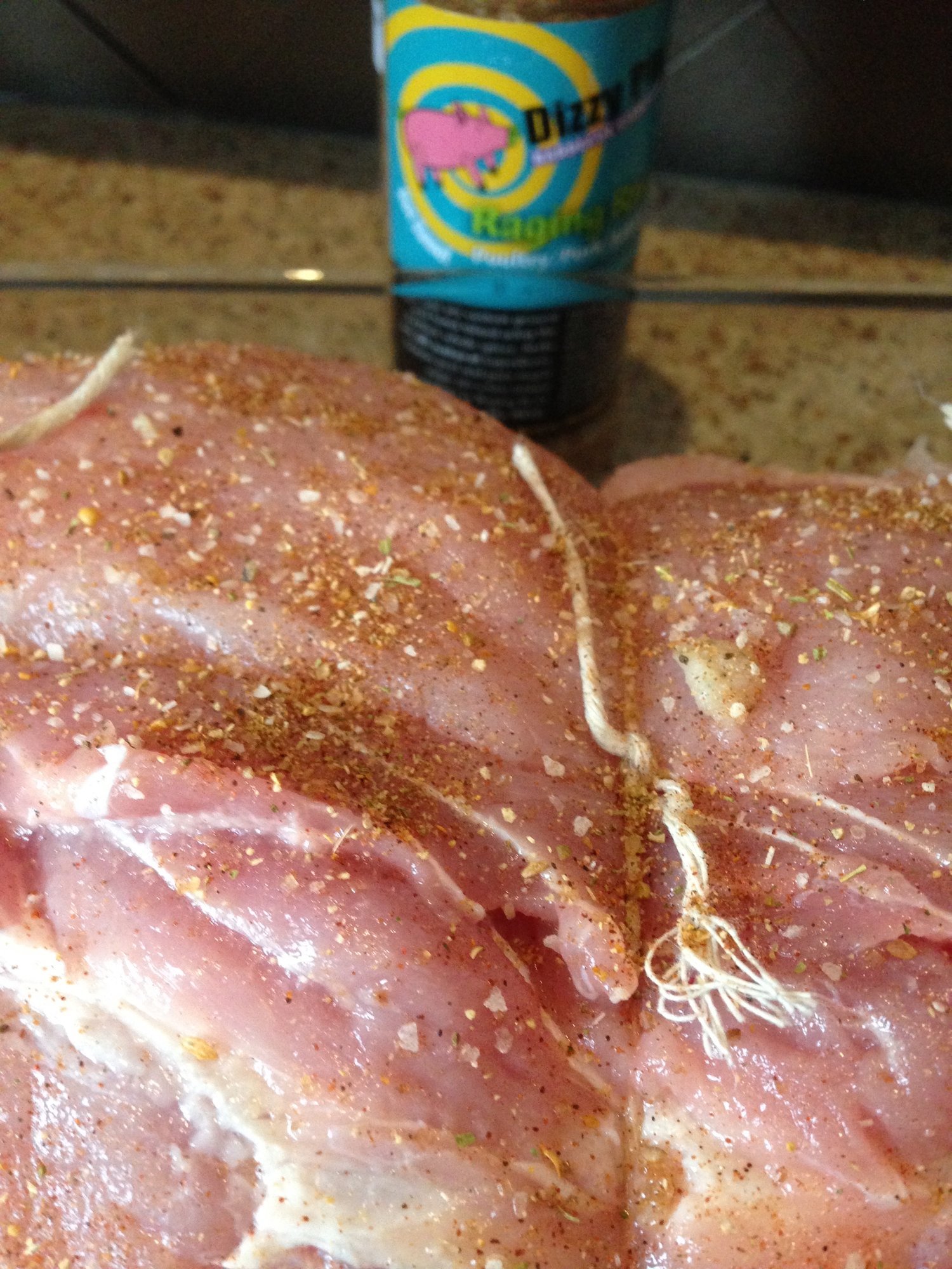 Spread the stuffing evenly on top of the loin and roll it back up to the shape it was when you picked it out of the herd. It's bigger now, so tie it up tight and sprinkle Dizzy Pig Raging River all over the top.