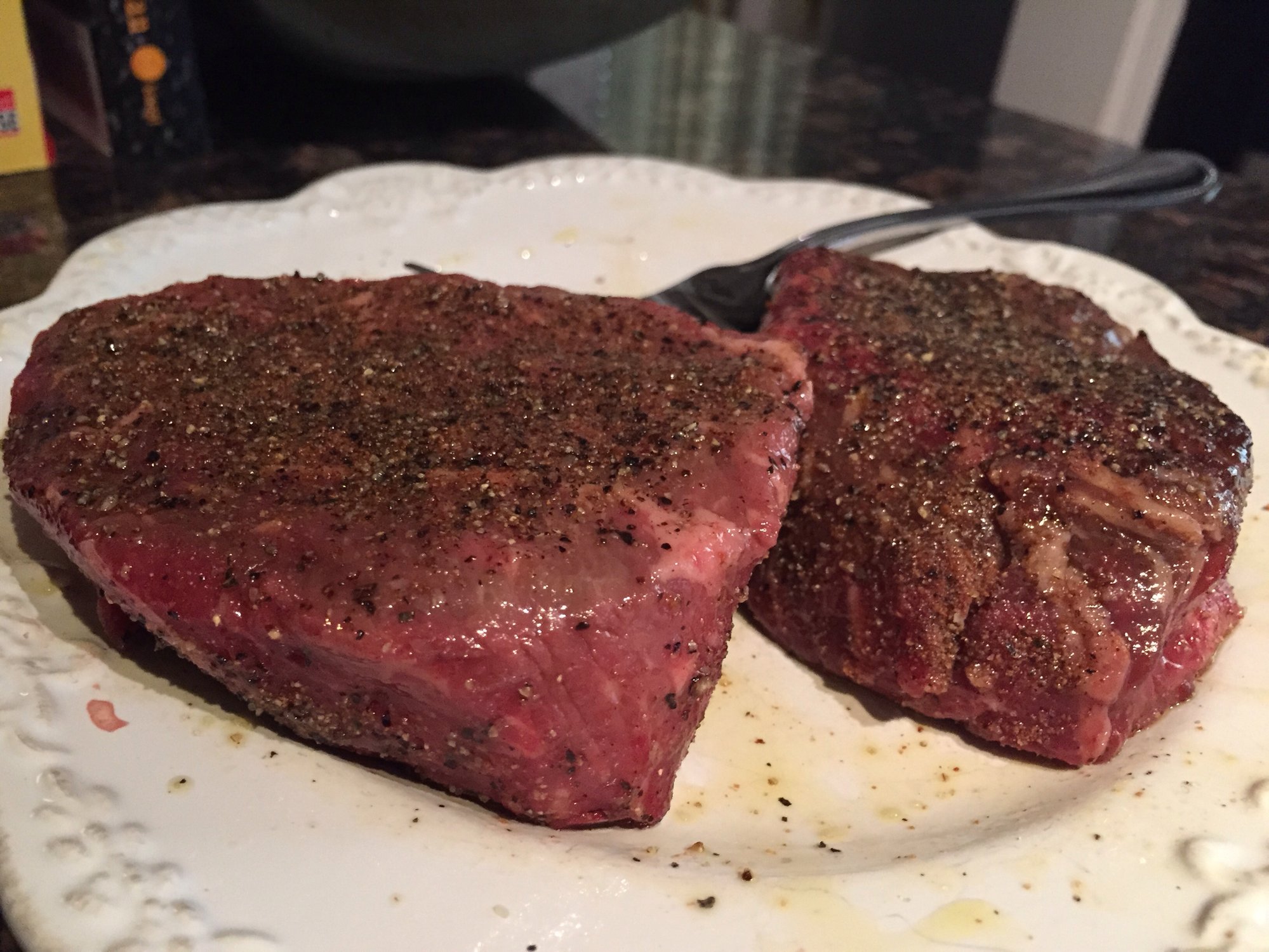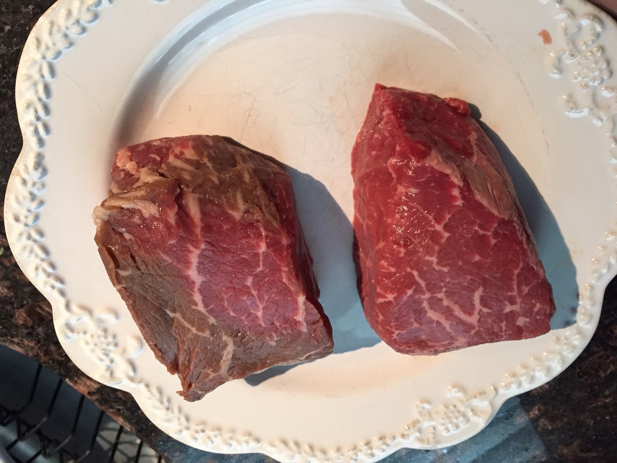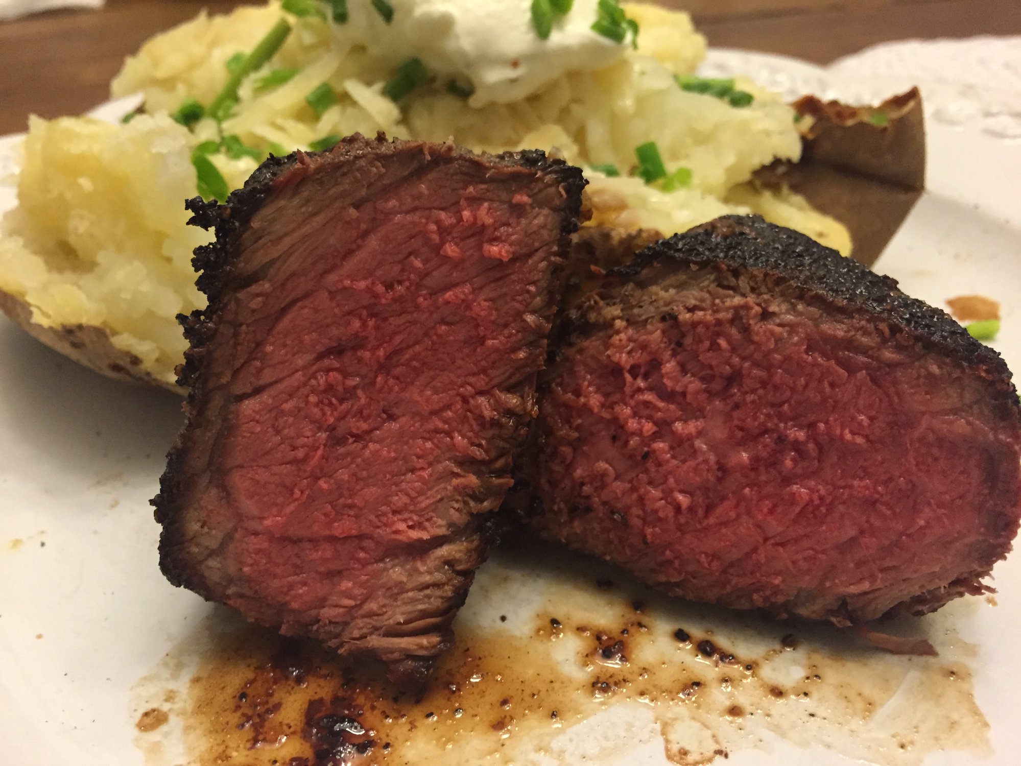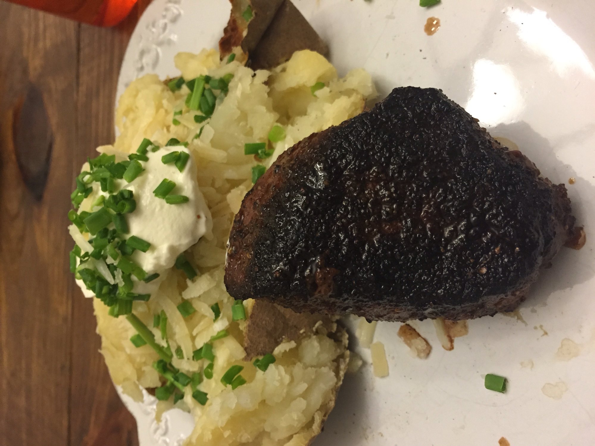 I'll start by saying these weren't as good as the Valentine's Day wagyu ribeye filets, but they were the best $10 steak and best sirloin I've had. Seasoned with jalapeño salt, penzys garlic seasoning, S/P and evoo. Into CI at about 600 with butter and olive oil for 90 sec per side then to raised direct until 125 for me and 138 for the Mrs. Had to wait a while on the Baked potatoes to finish inside, so mine overshot my moo-ing MR but still good. Will be be making another order from these guys very soon.