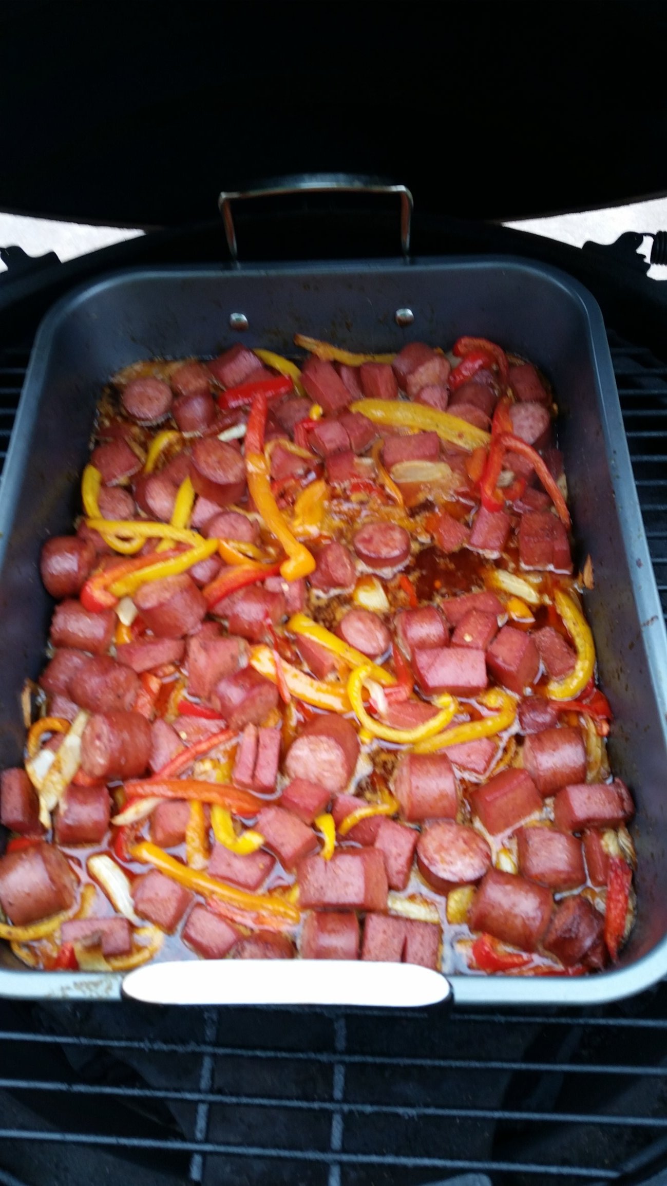 I tried a recipe from Jeff'a Smokin Meats and it turned out fantastic. I cuthe up some Bologna, Kilbalsa and veggies. Poured on some olive oil and sprinkled a 1/4 cup of R Butte R Smokin for pork and Ozark Heat. Smoked it with peach and pecan wood for 2 hours at 225 to 250. We had some neighbors over to help us eat it.