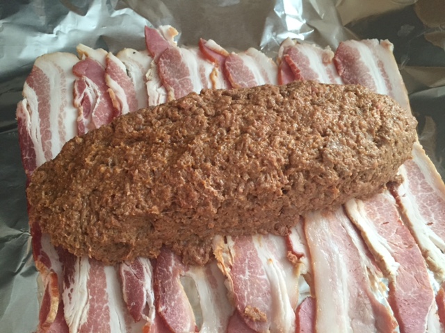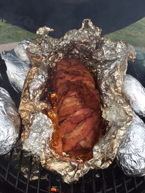 This was too good and easy…make your favorite meatloaf, form it into a log and wrap with bacon…I used thick-cut platter-style bacon. Wrapped in foil at 275 until the meat is nearly done, then opened up and let the heat go to 400+ to crisp the bacon. Easy clean up, too! Bacon makes it all better!