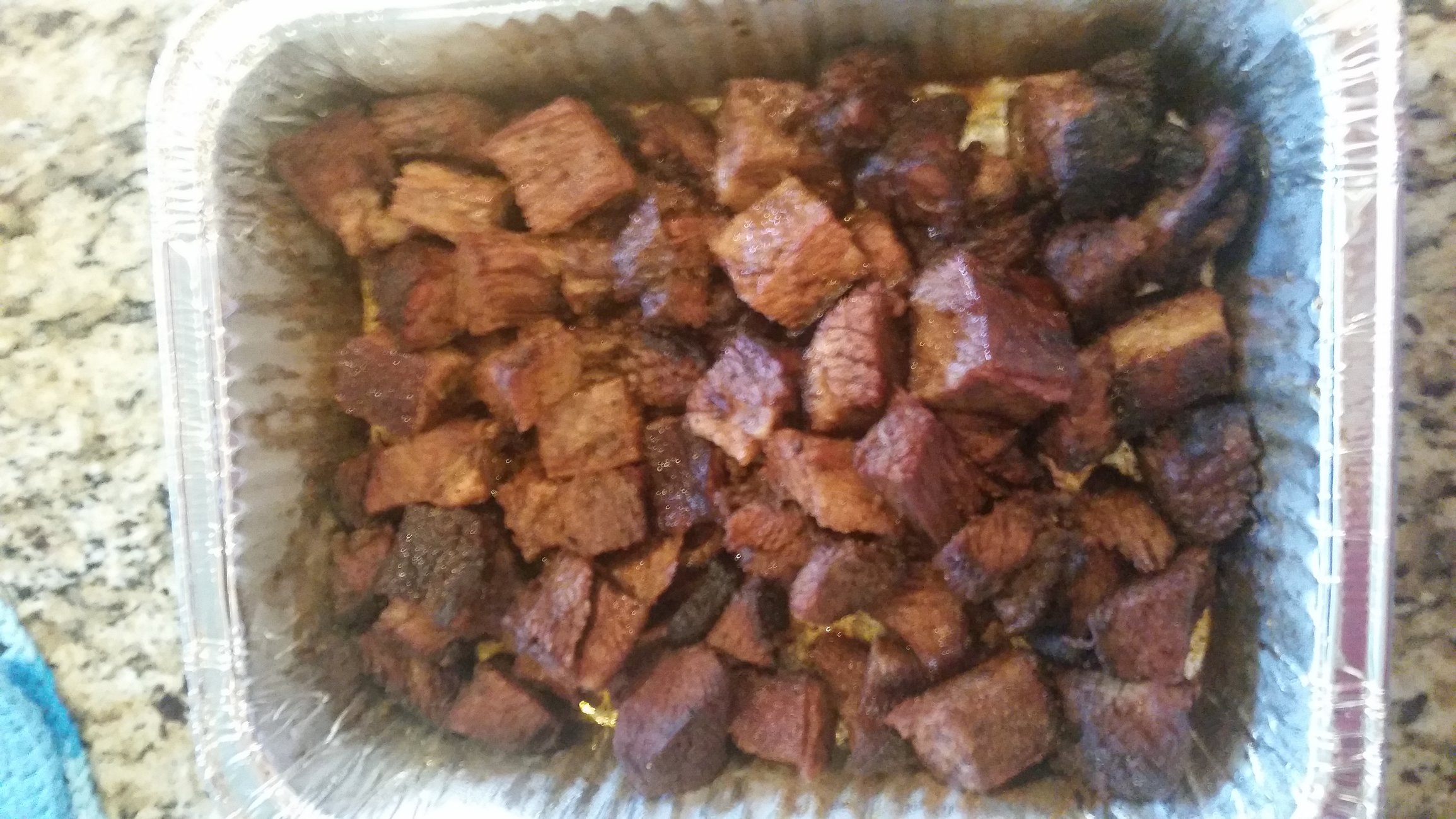 @grege345, they are like meat candy to me and my wife. I like to leave a little fat on them.. After the full brisket has rested for at least 15 minutes, separate the point from the flat. Cube up the point in about 1" chunks, put them in a foil pan or in foil, sprinkle some more rub on them and I like to use the juice from the brisket, but you can use sauce. Put them back on for about on hour to crisp up a little. I need to a step by step photos and video on how to do it.grege345 said:Nicely done. Still havent had burnt ends
