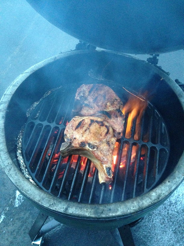 Once the chops were up to 130 IT, I set them aside, removed the woo, and left the lid open while the grill went nuclear. Finished with a quick sear on the chops.