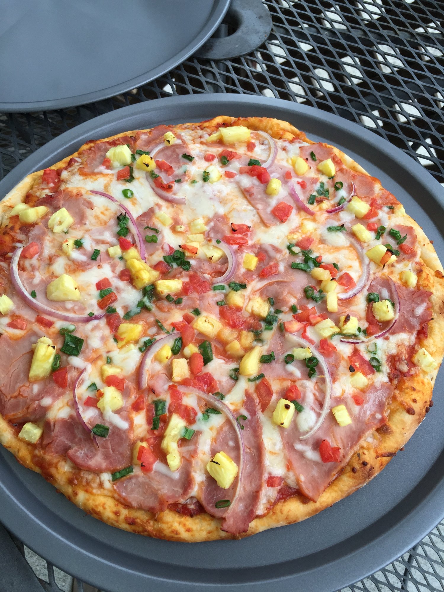 Third pie: Ham, Diced Pineapple, Diced Tomatoes, Green Onions and Red Onion.