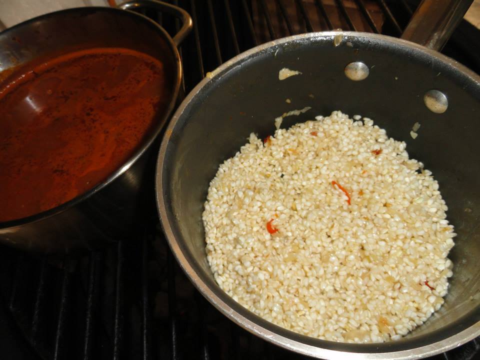 We toasted the rice with evoo and onion and we added the hot sauce without using cold wine after toasting the rice because that will stop the cook of the rice and the starches wont be released
