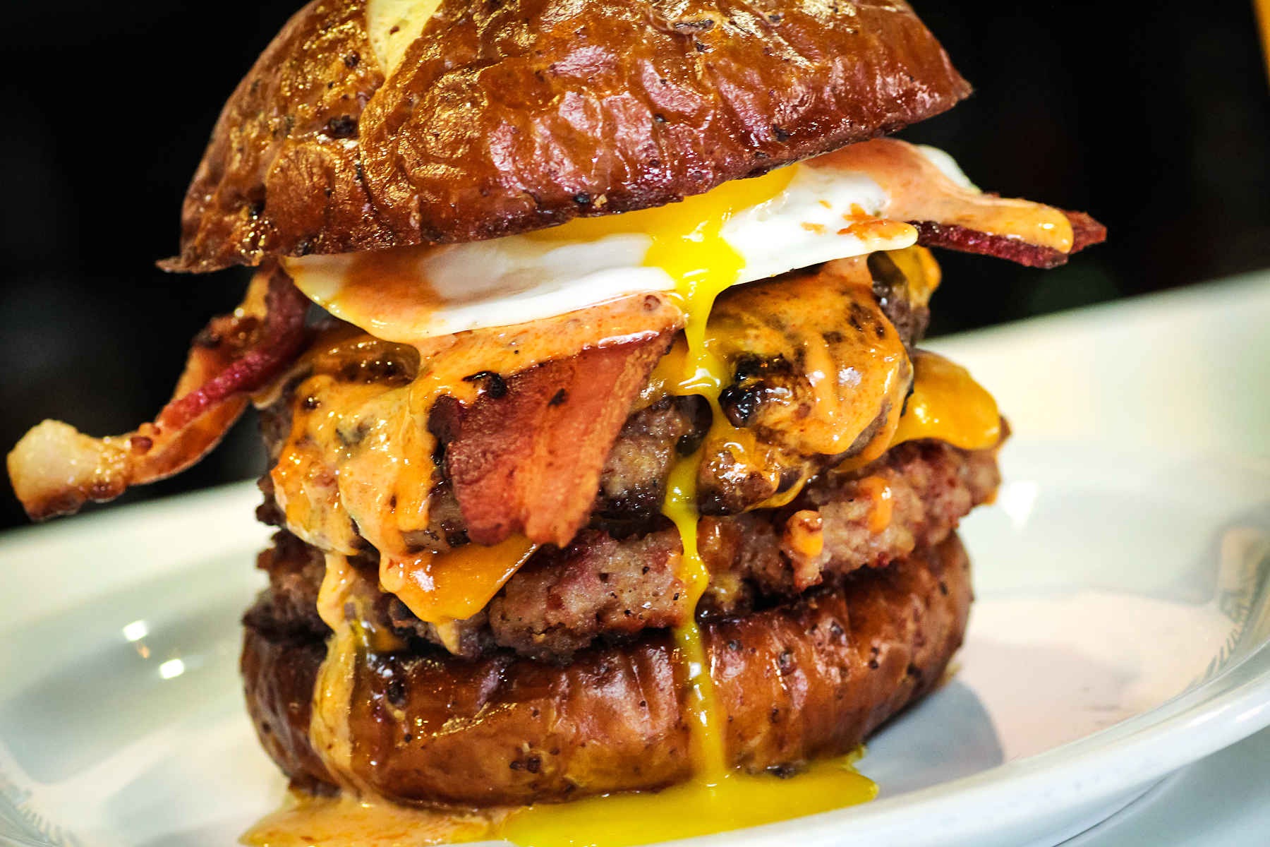 I think a lot of places use the egg to add moisture to otherwise over cooked burgers. That being said the best "burger" I ever had... Slater's 'Merica burger. 100% ground bacon. I recommend sharing it with friends. You'll all be happy and so will your arteries. It's only offered on a limited basis.