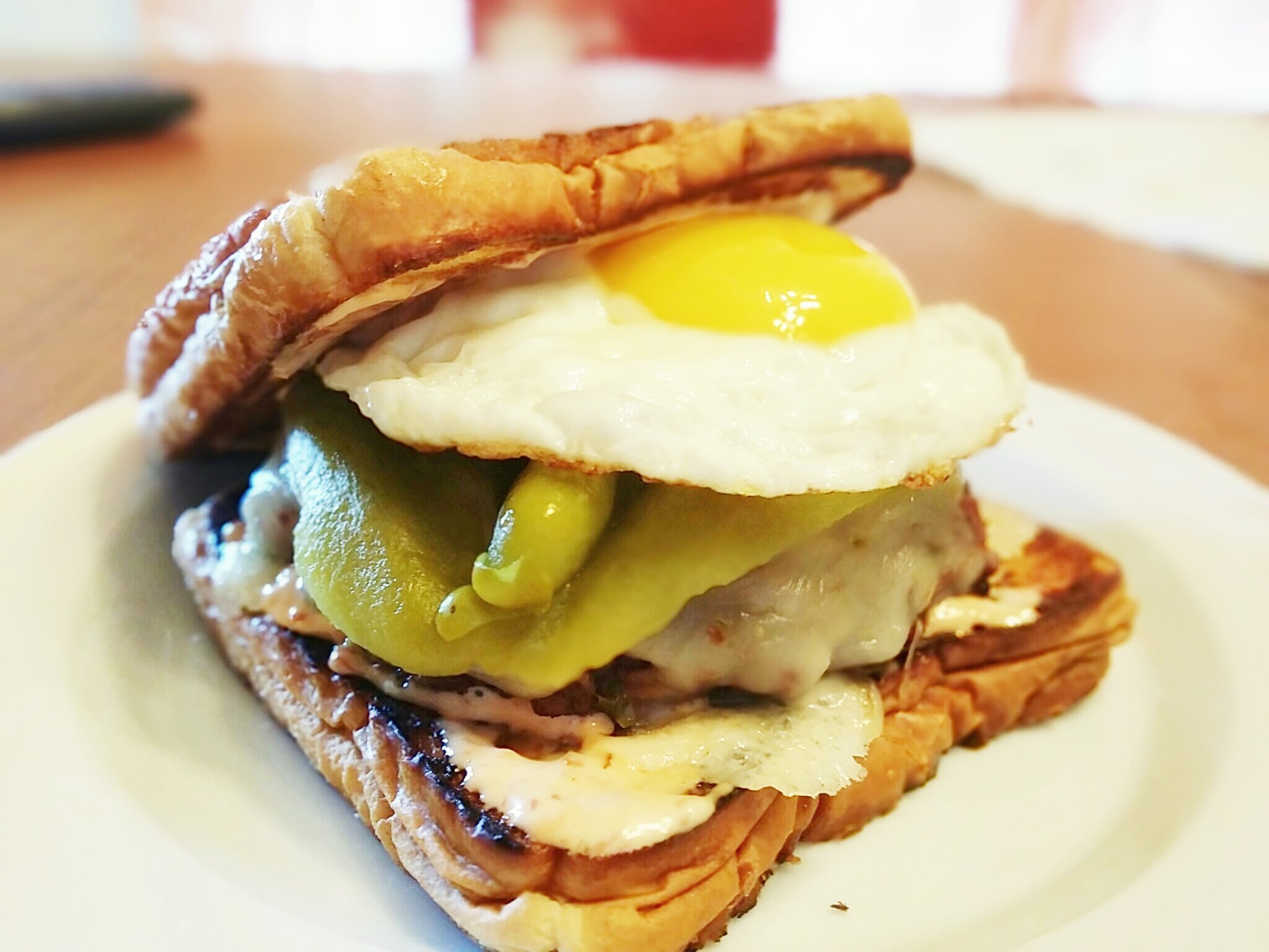 Fried egg is where it's at. This one's on grilled cheese sandwiches with a spicey Chipotle mayo and a green chili.