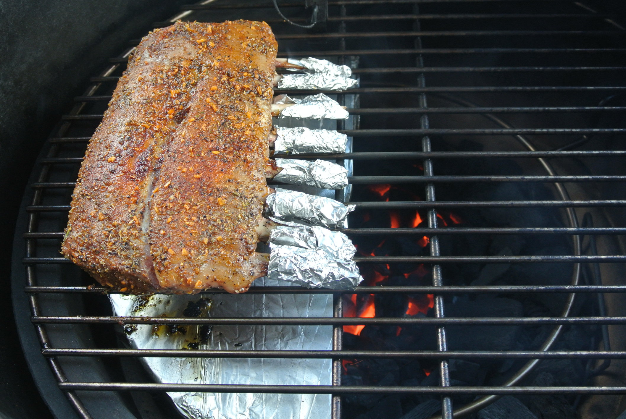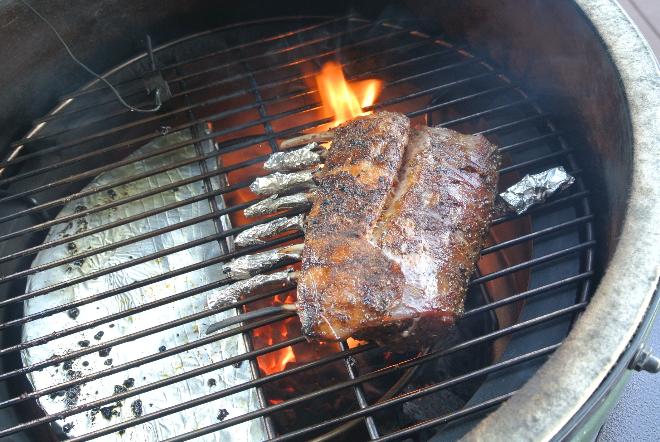 I've cooked lots of roasted legs, chops, and braised shanks but until last night never a rack. I slathered the rack in cold pressed garlic olive oil and made a rub of roasted garlic powder, Spanish smoked paprika, oregano, sea salt, and fresh ground pepper. I brought the Egg up to 375 with a two zone set up using a half stone and a spider under the main grate. I started the rack indirect and brought it up to 115. Then I let the Egg come up to 400-425 and did the hot potato flip over the coals until I got an IT of 130-135 and the crust and color I wanted. It came out great, very tasty, and extremely tender. Crispy lamb fat is almost as good as pork fat IMO. Here are some pics.