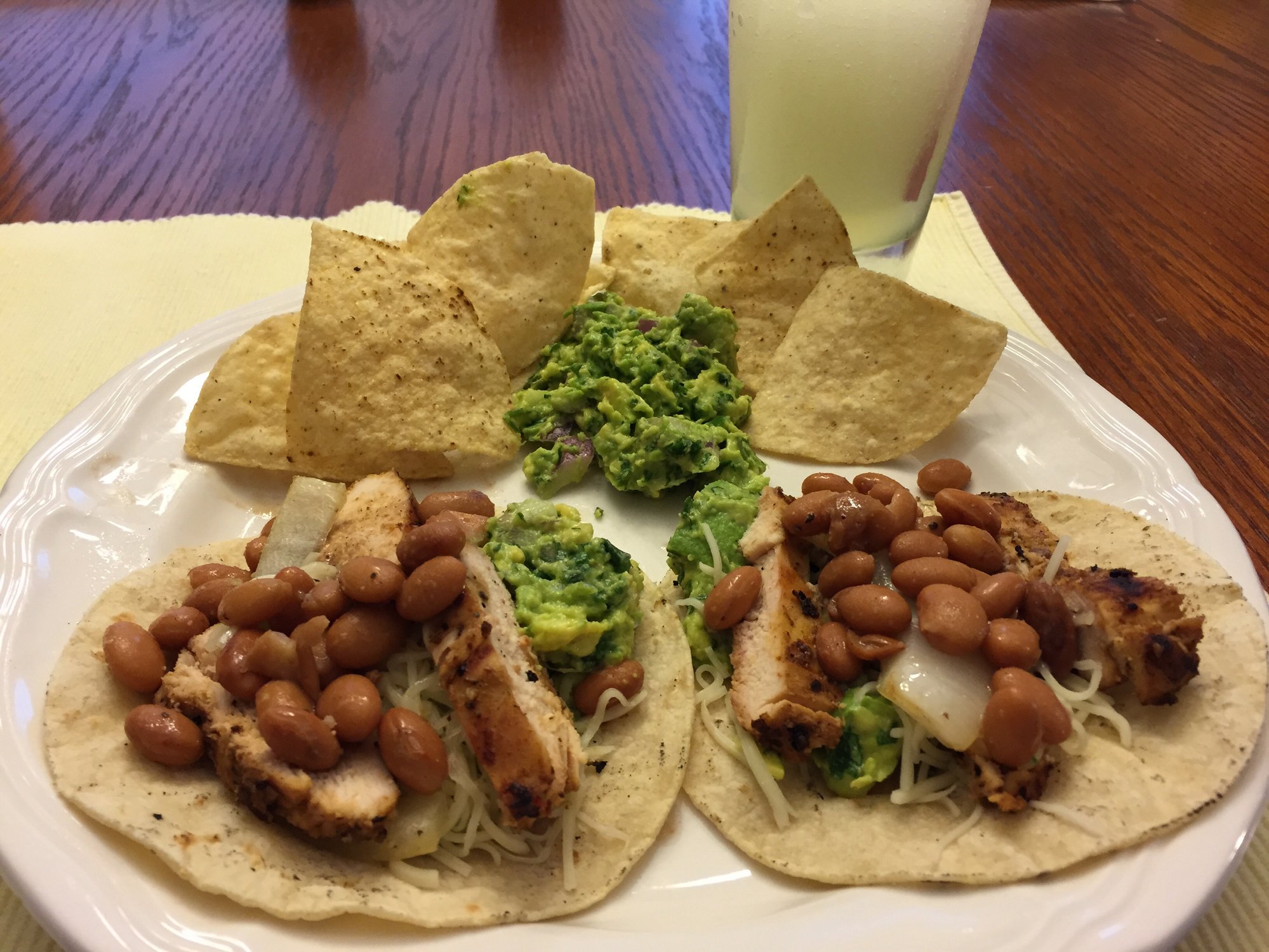 Toasted corn tortillas. Mashed up leftover BBQ Baked Beans with pulled pork. Leftover short rib + spare rib meat diced next. Then my wife's homemade guacamole, lettuce, tomato.