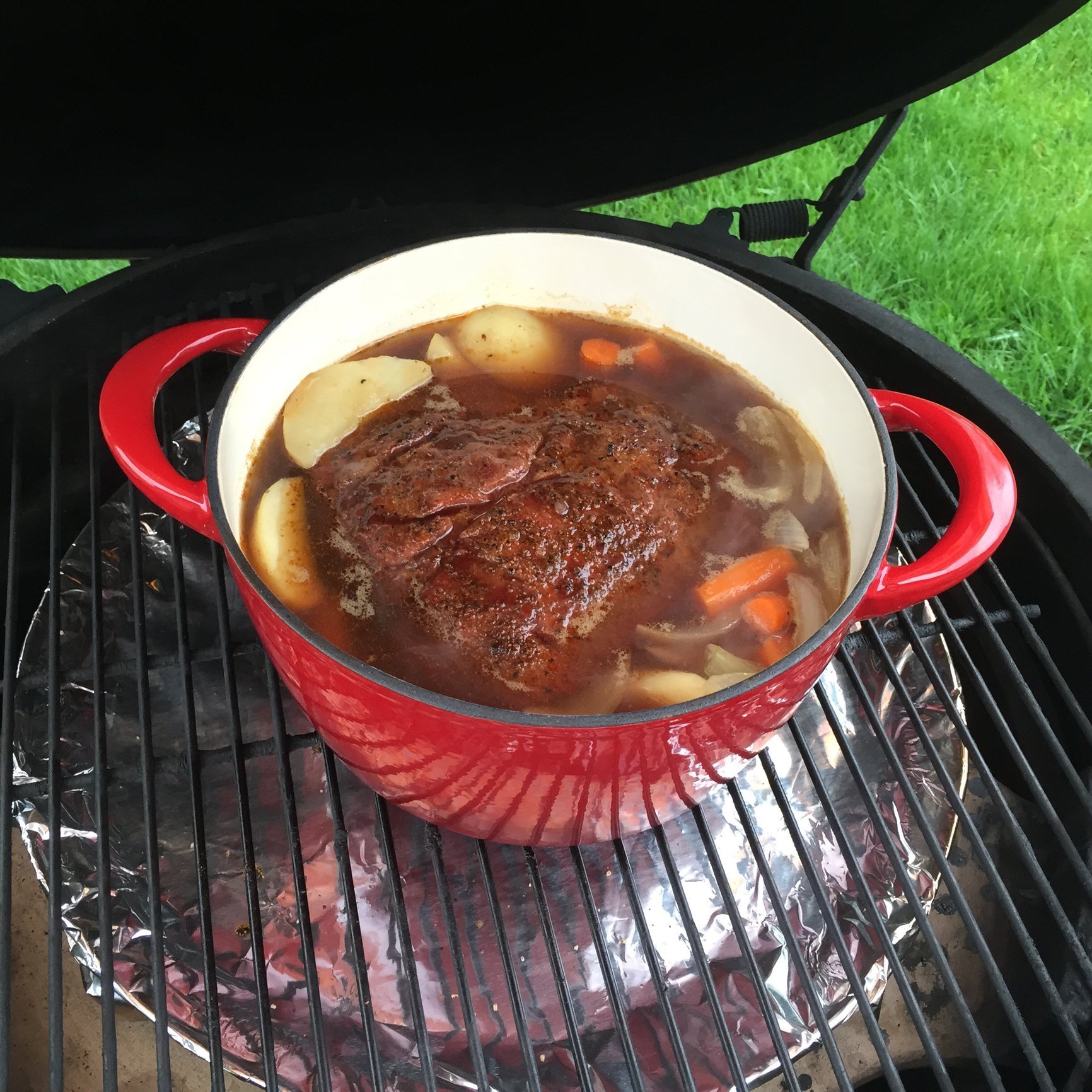 Little fella 2 1/2 pounder EVOO and rubbed with DP Cow Lick and smoked for 90 minutes at 250 indirect before adding it to the Dutch Oven with potatoes carrots and onions plus Beef Broth