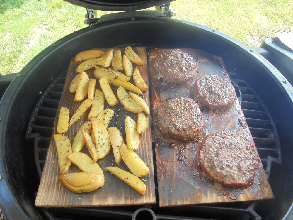 How about burgers and potatoes? A friend of mine did these last week. Very good burger - different, but not better.
