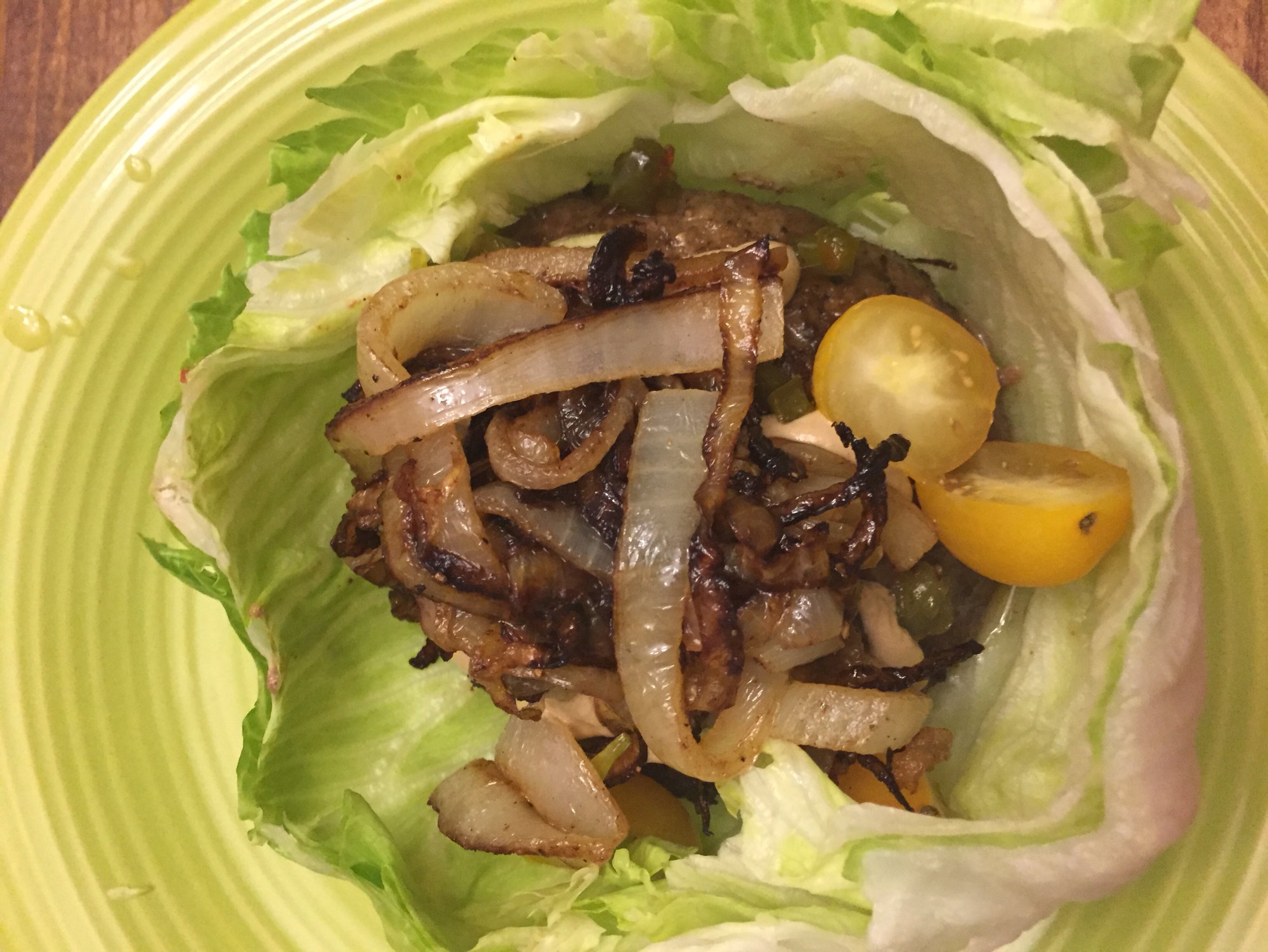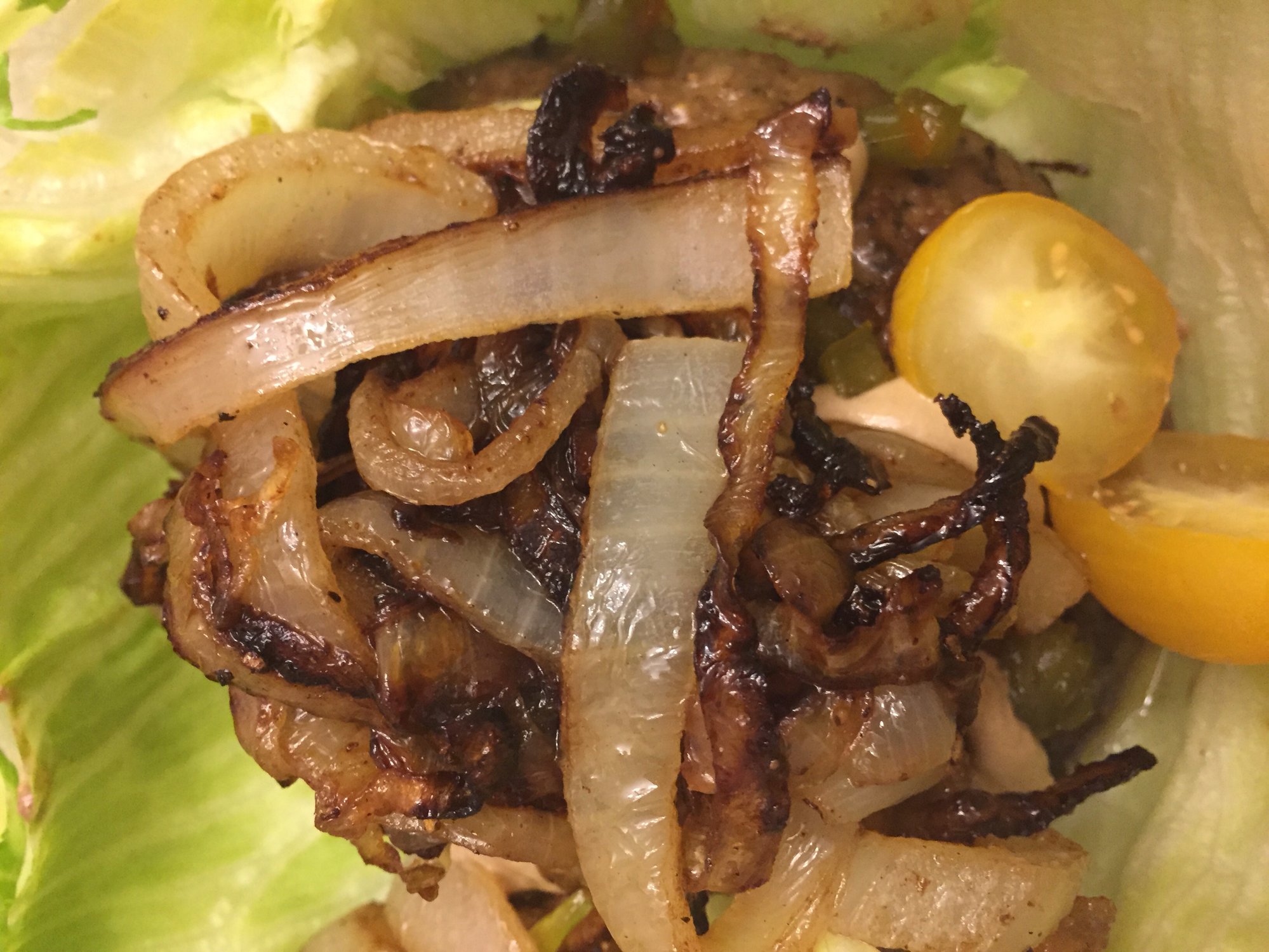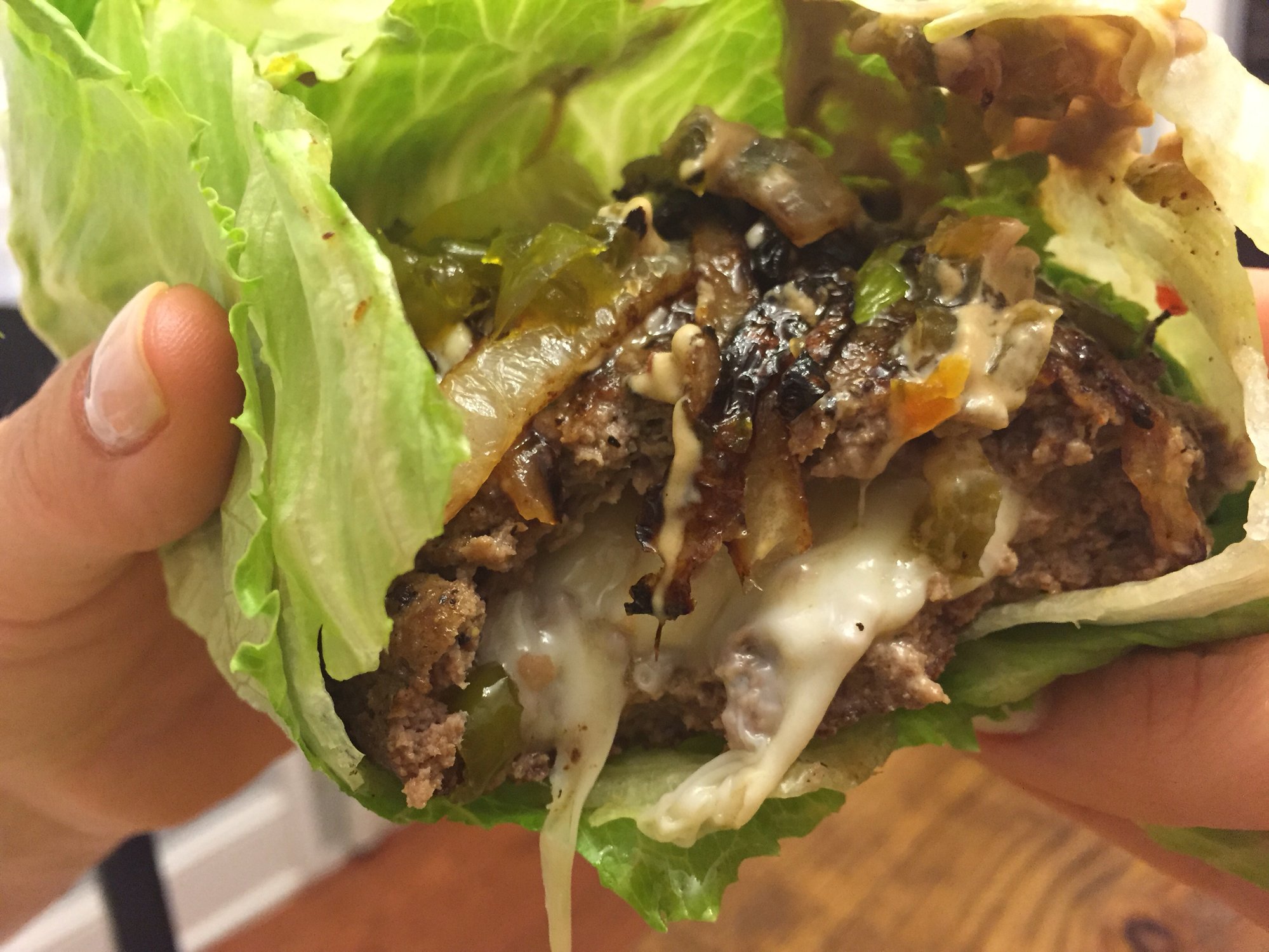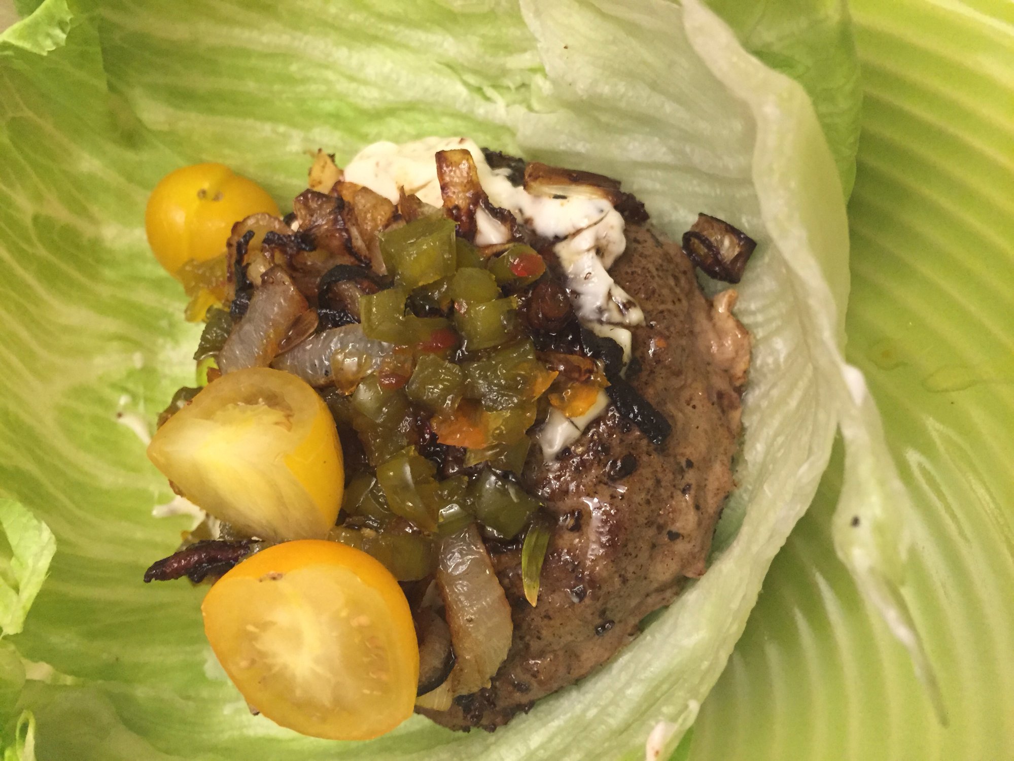 Best burgers ive ever made. Had 1.05# grass fed ground beef ($2.99/lb every Tuesday at fresh market along with BLSL Breasts). Added a splash of allegro hot and spicy, 1 yolk, cumin, cayenne, SP, and chili powder. Split into 4 equal patties and topped 2 with a thick slice of bleu cheese, added the top then worked them into patties. Brushed Evo onto both sides and added more cumin, ASAP for a nice crust. Beforehand, we had carmelized some onions and heated up some pepper jelly with some sliced jalapeños and vinegar for a jalapeño relish to top the burgers. 3 minutes in CI on each side then into over at 400 until probing 160 (5-7 minutes). Served in an iceberg lettuce wrap (only thing healthy about this meal).
