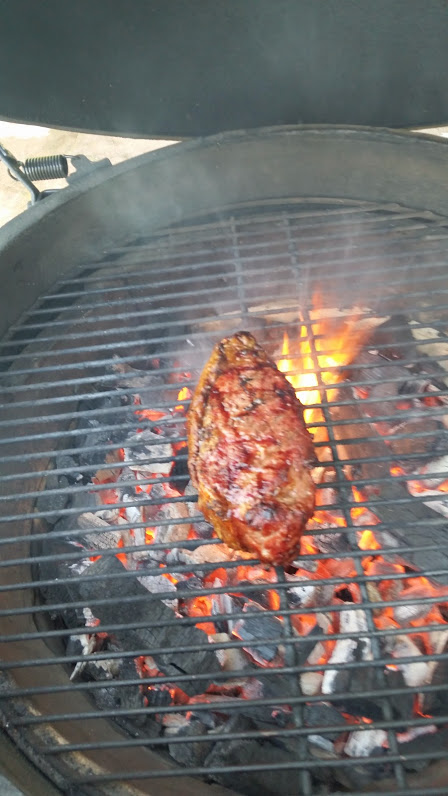 Wednesday night I cooked a large strip steak on the XL.  It was good as always.  Got the egg up to ab out 400 and used my CI skillet and raised grid to go indirect for about 25 to 30 minutes when the steak got to about 110 to 115.  I pulled off the skillet and steak, opened up the vents to get the egg to over 600.  I then put the steak back on and seared it a 2 minutes on 3 sides.  I didn't do the fat side, because I wasn't planing on eating it and it was done at 138 to 145.  Now I need more steaks.