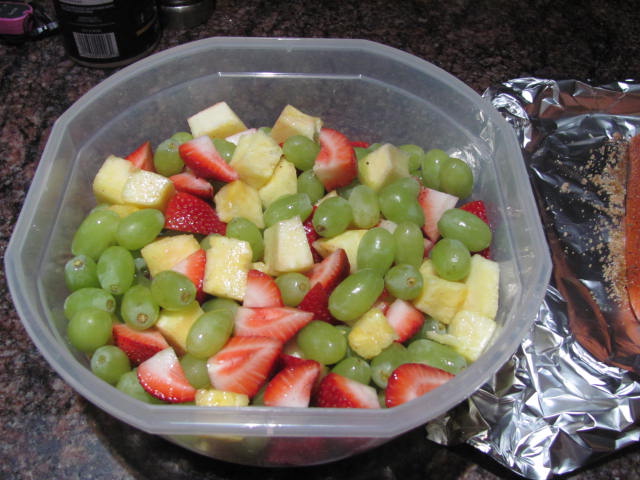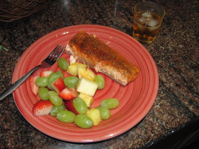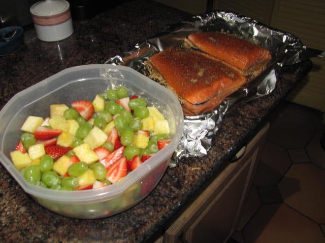 A couple of filets and some fruit salad. Nice and light. As usual I cooked twice as much fish as we really needed.