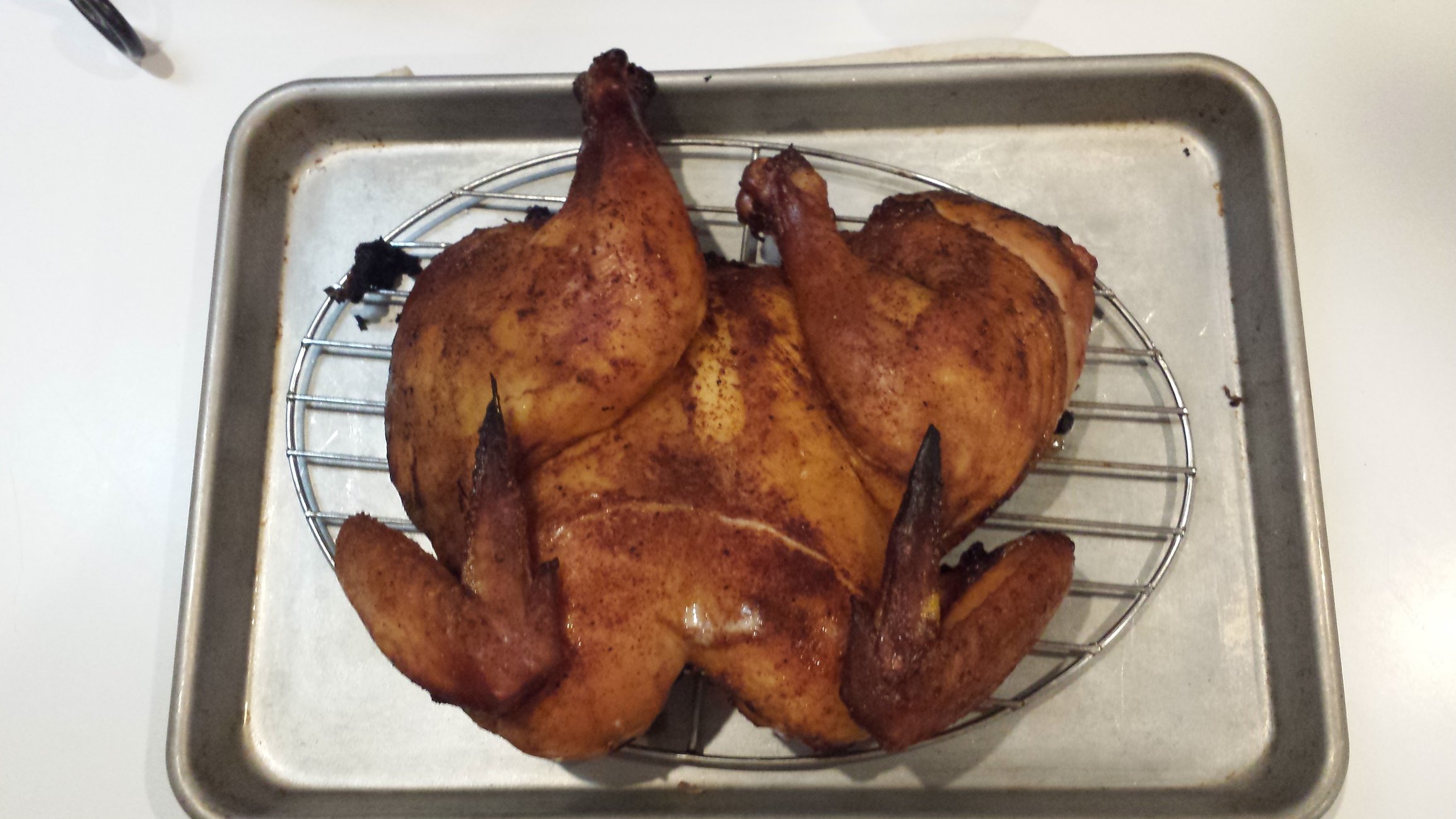 Brined a 5 lb roaster in a salt and molasses brine for 10 hours. Rubbed with a Weber Kansas City Style BBQ rub. Cooked raised direct at 375-400 for about 45 minutes. Resting now. Will comment on taste after dinner.