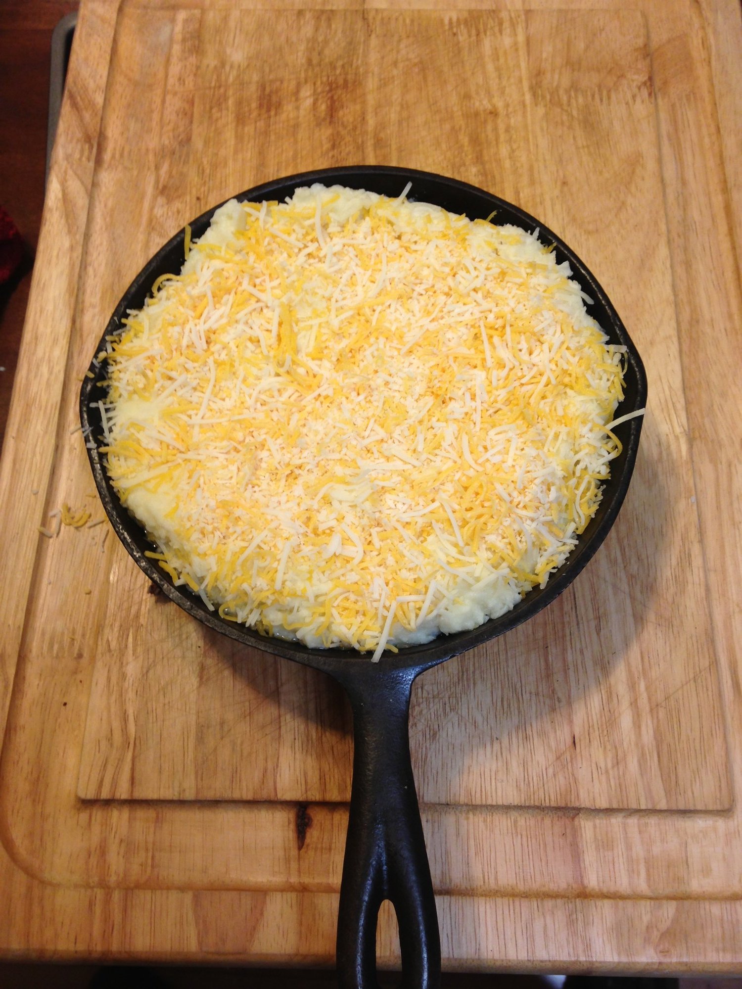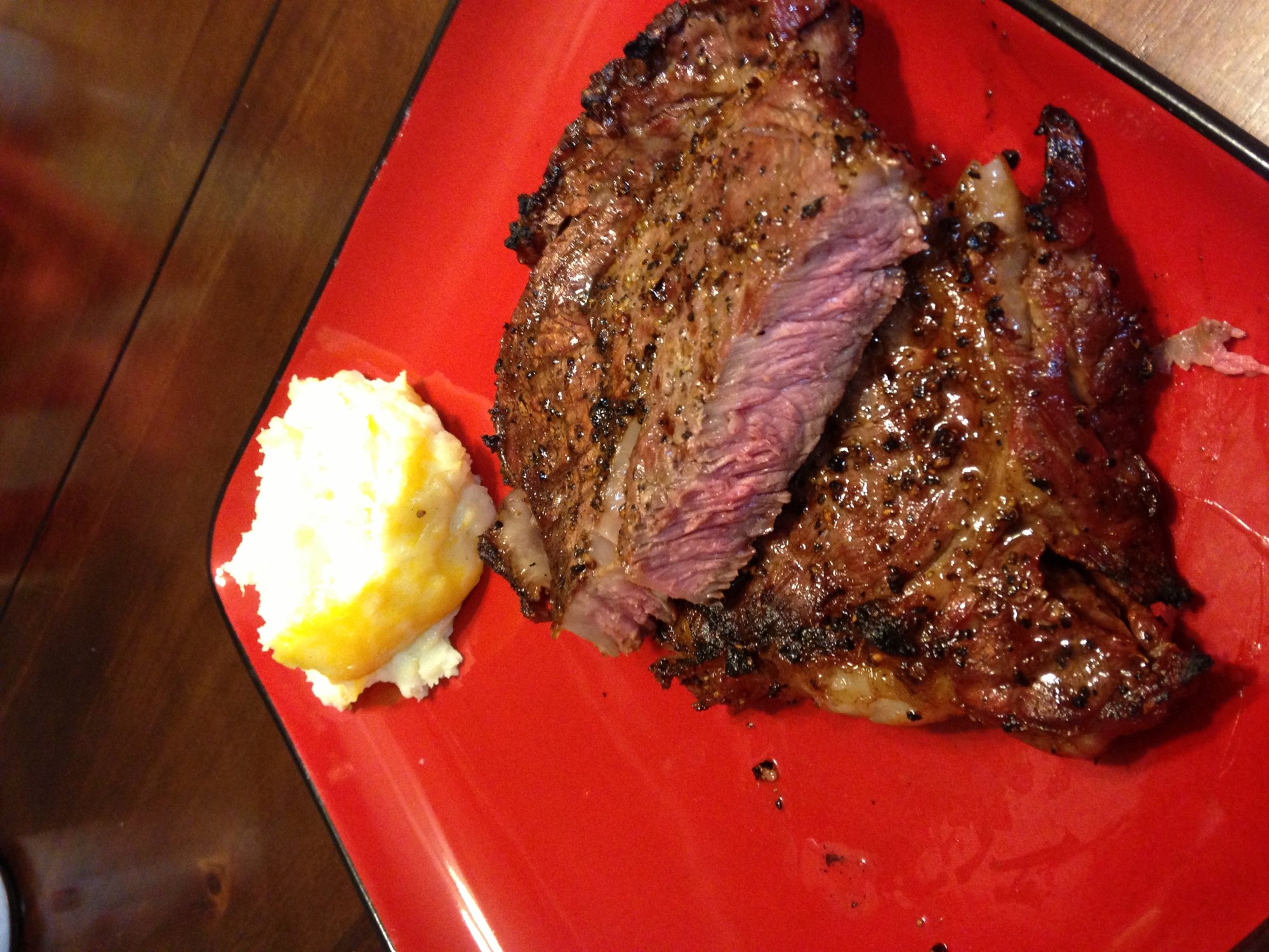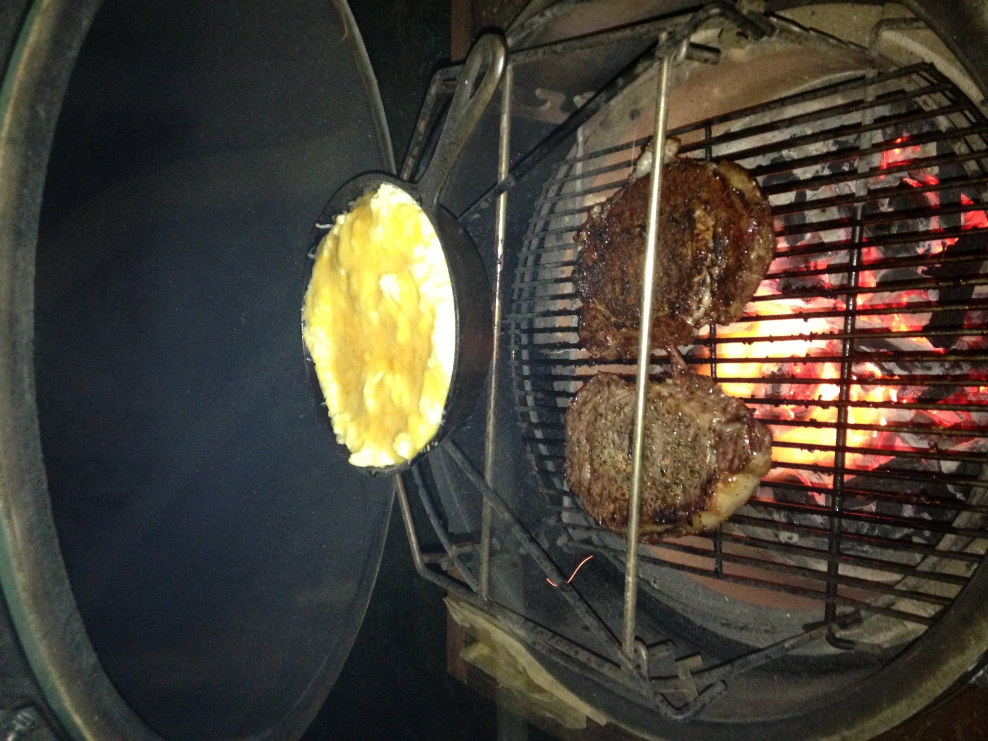 Did a couple ribeyes tonight. One with coffe rub for SWMBO. Mine with some Montreal Steak. Reverse seared them for the first time. Mashed some potatoes. Mixed with butter, milk, Colby cheddar cheese mix, and garlic powder. Placed in cast iron on the egg. Turned out pretty well.