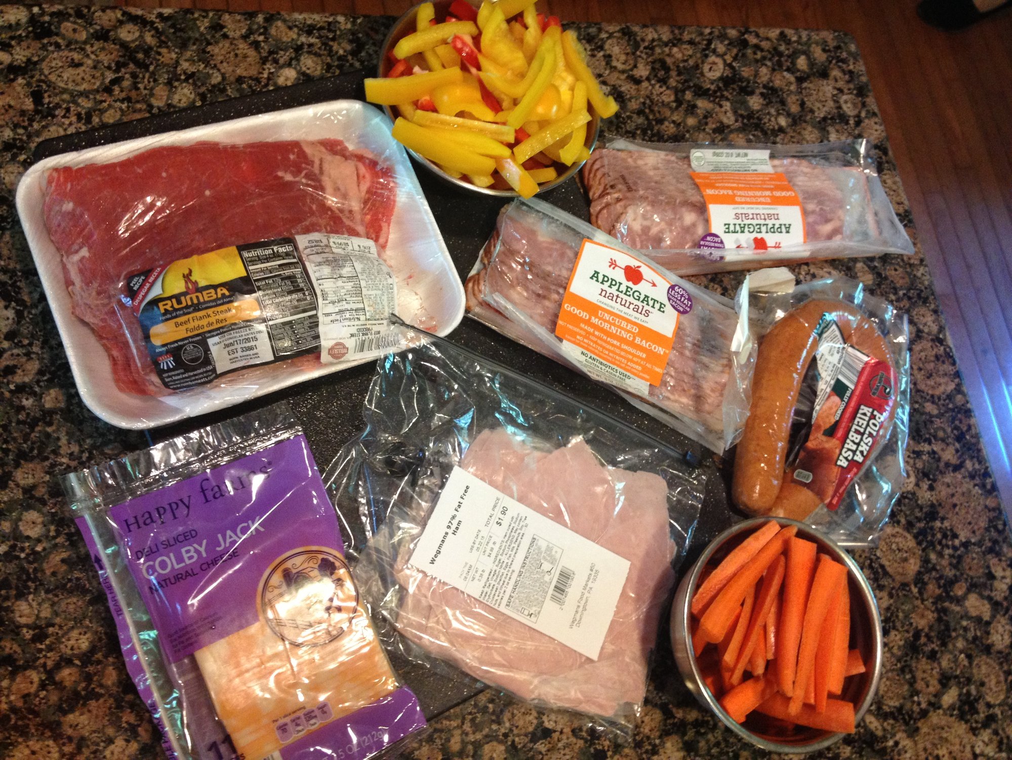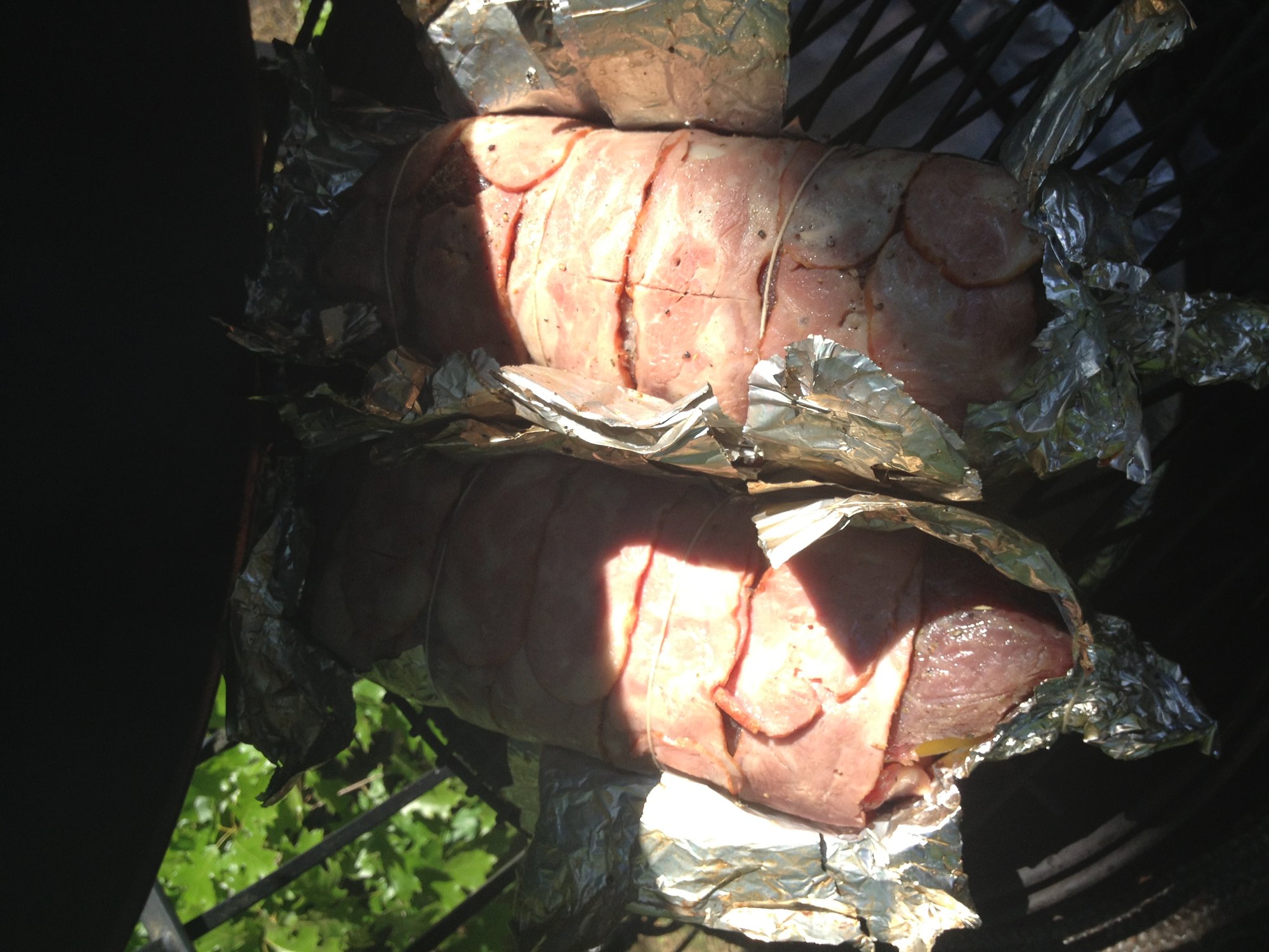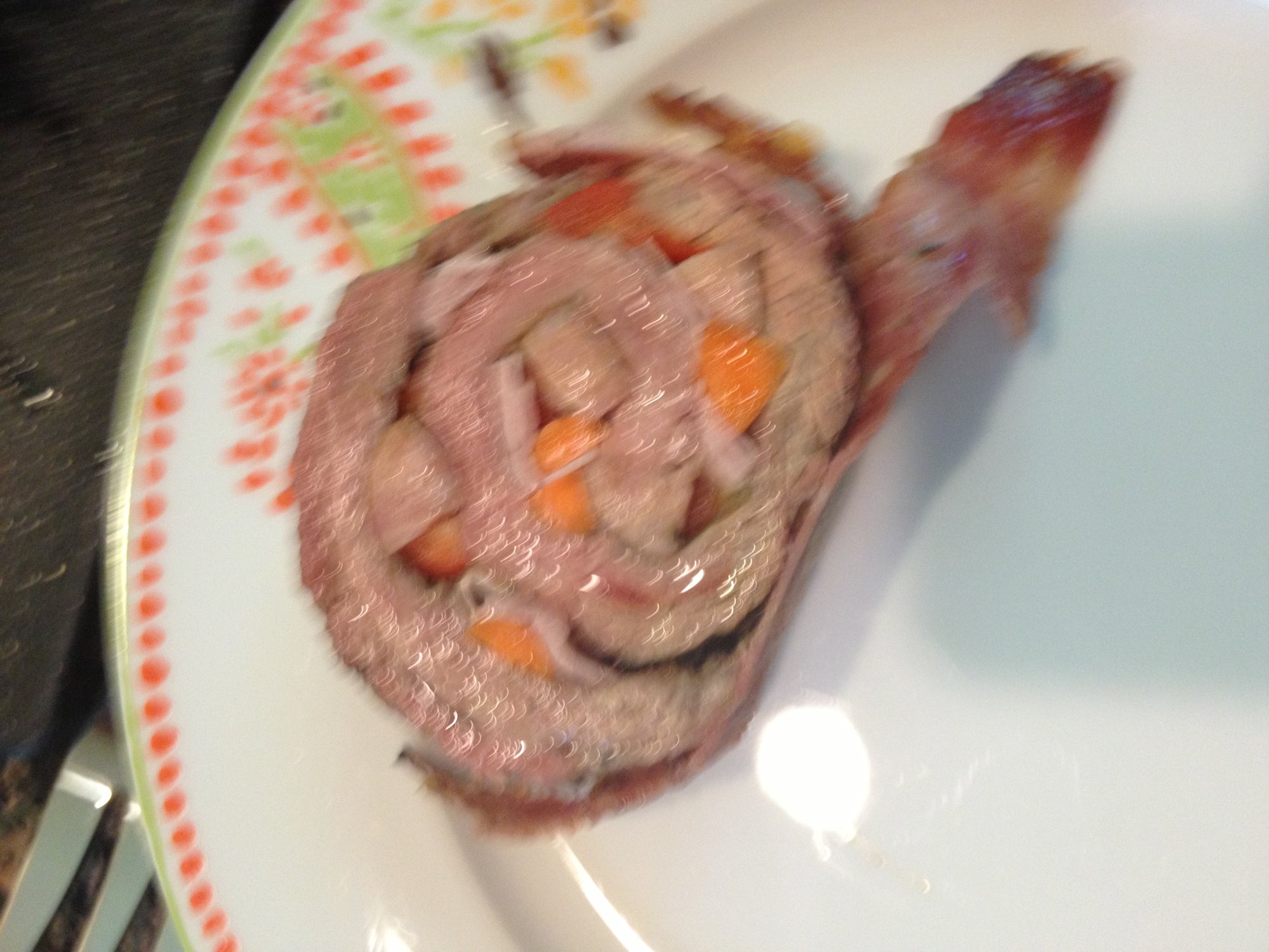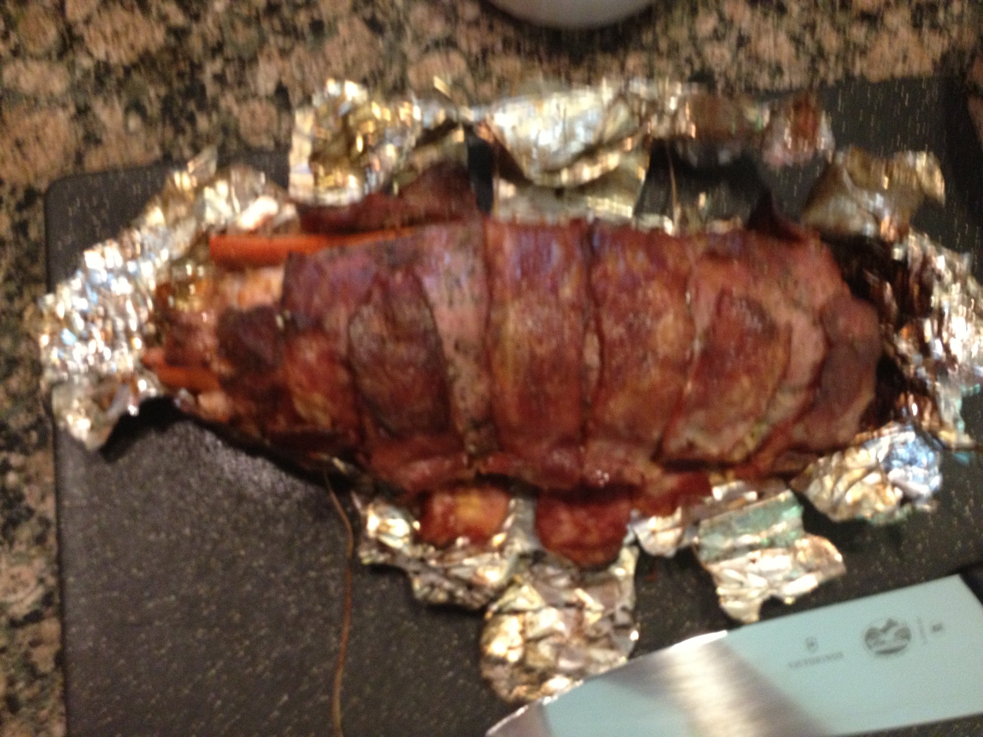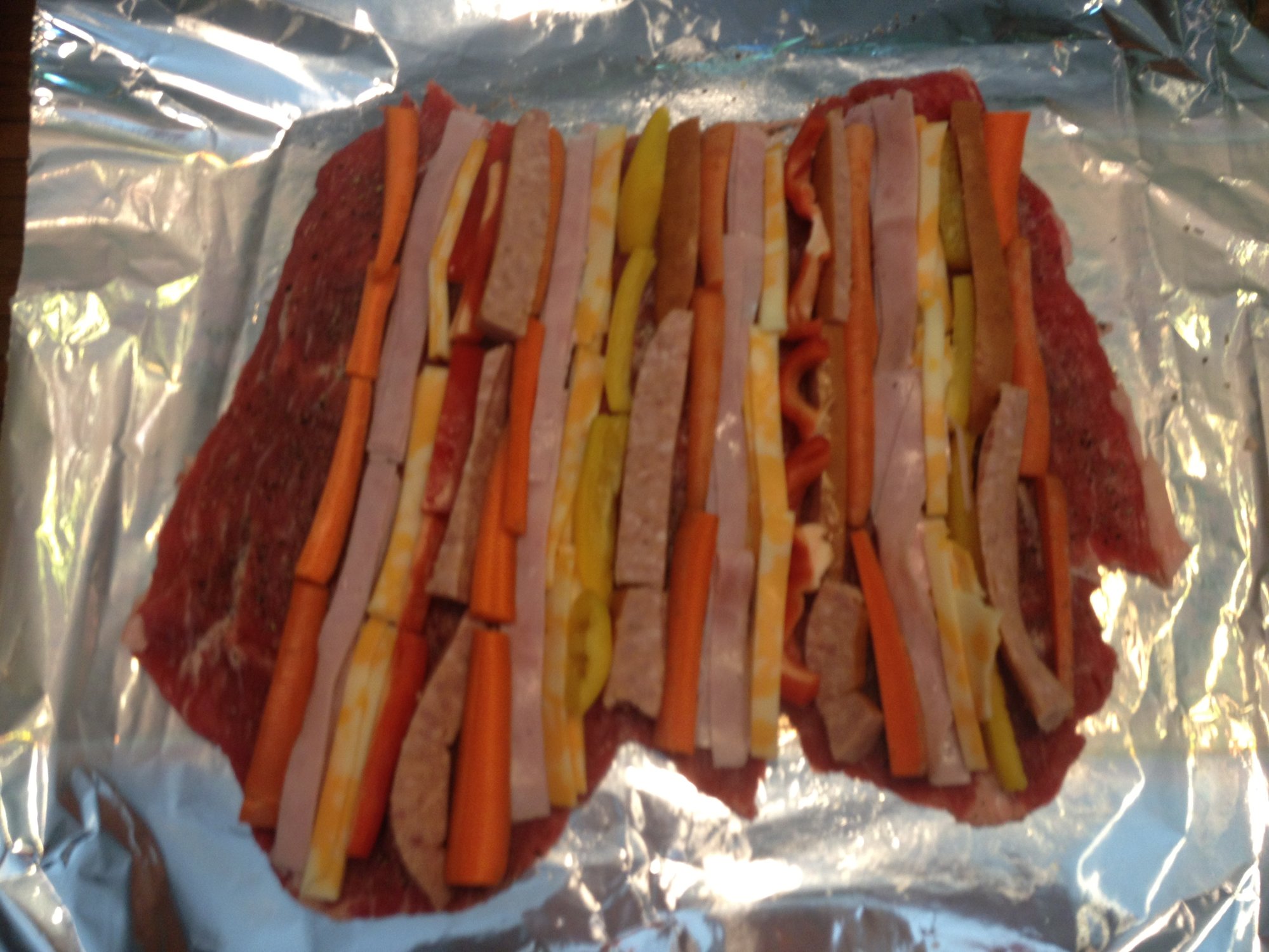 We had some family friends over today and with half of the group being from South America, I decided to make some matambre for the main course. Picked up a couple of choice flank steaks at BJs and had the butcher there do most of the knife work to butterfly it. Seasoned the meet with S&P, garlic powder and Italian herbs. The stuffing was carrots, kielbasa, bell peppers, ham, cheese. I lined the rolled up steaks in bacon then wrapped the matambres in foil and tied them down and stored them in the fridge for a couple of hours to let the shape set.