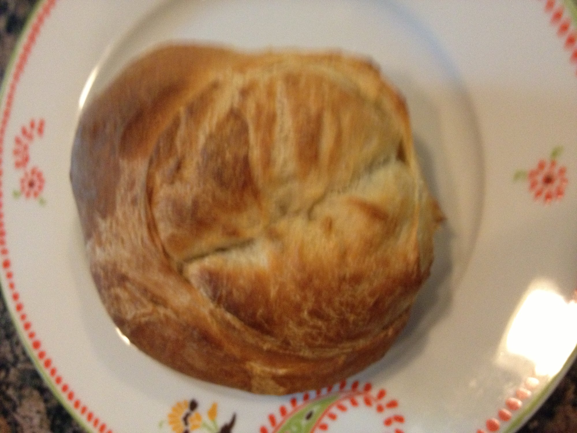 Then, I did a bit of a cheat in bread baking. My family loves bread that I make from pizza dough from our favorite local Italian restaurant. I worked the restaurant made dough into a ball with a few pats of butter mixed in then put it on my pizza stone in the egg at 425ish. A pic of the raw dough from today is attached. Since I forgot to get the pic of the finished bread, I am attaching a pic of a prior finished boule.