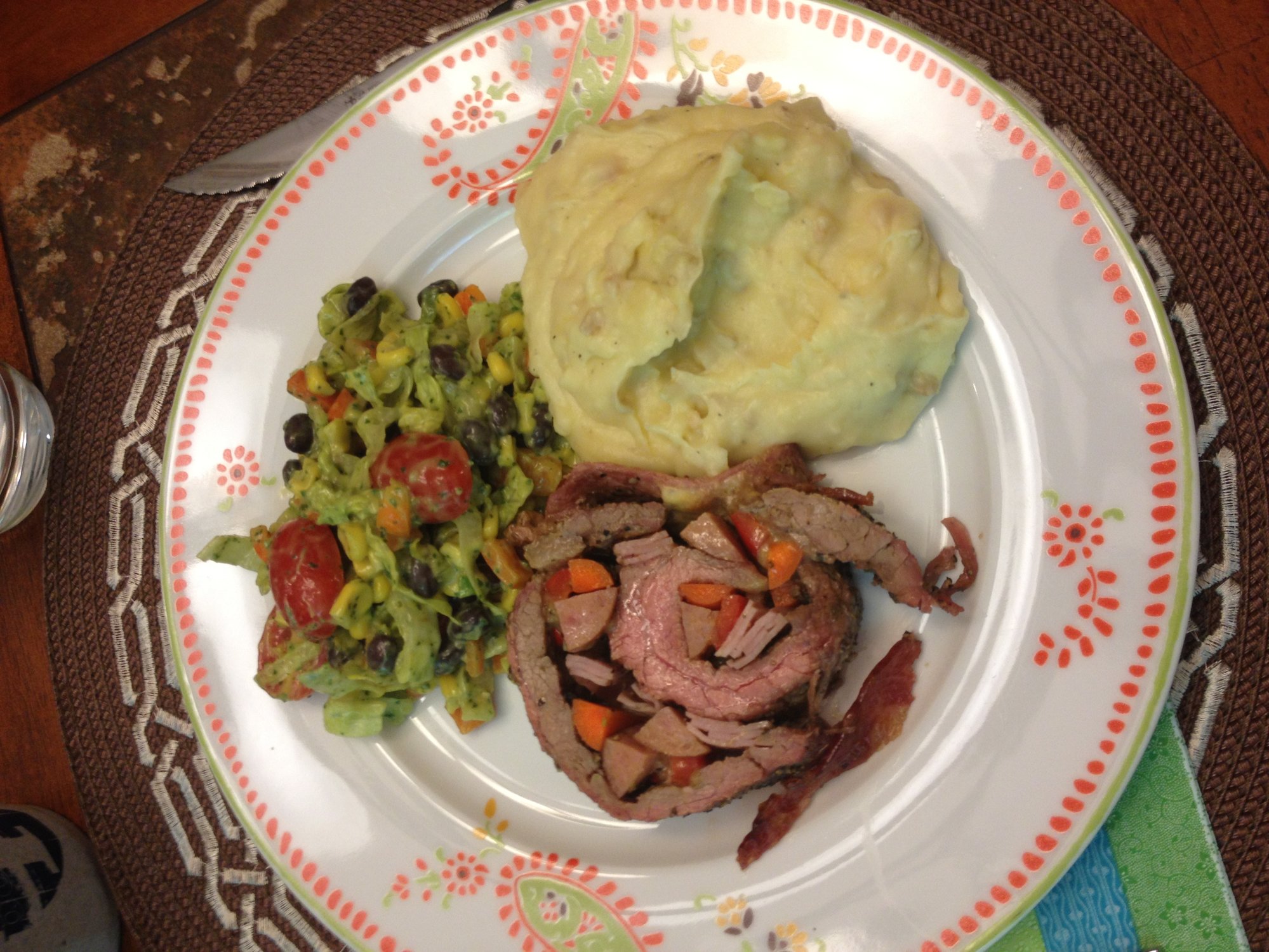 When the bread was finished, I removed the pizza stone and put the matambres on, indirect, with some cherry and mesquite chunks at about 450. I saw that some on the site had previously knocked matambre because it is traditionally wrapped in foil and was like being cooked in an oven. That inspired me to split the foil to expose the top of the matambres to get some smoke. Matambres were pulled with an internal temp between 145 and 150. They were fantastic. The crew raved about the matambre and the bread. It was plated up with SWMBO's excellent garlic mashed potatoes and a southwestern salad with a home made avocado lime dressing that my wife made for the first, but not the last, time. What a great feast!
