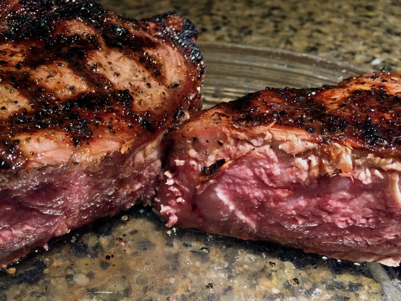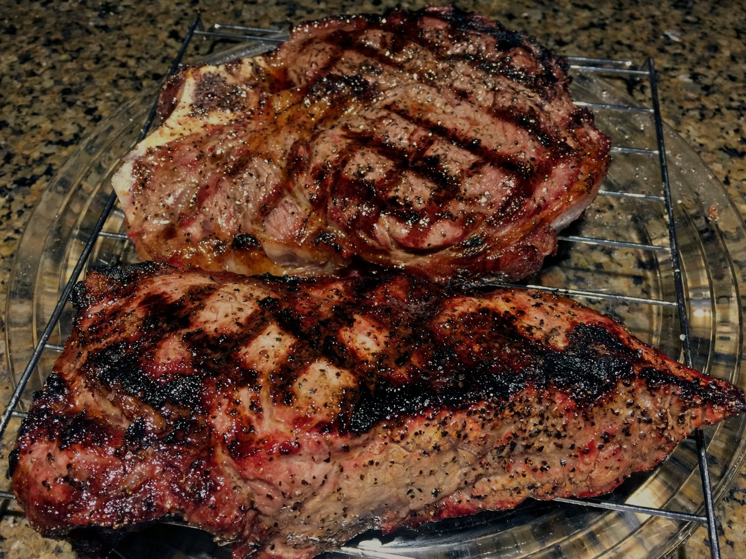 Pulled the ribeye first and then a few minutes later the strip. Resting on a wire rack under a foil tent right now as the BGE temp heads north.