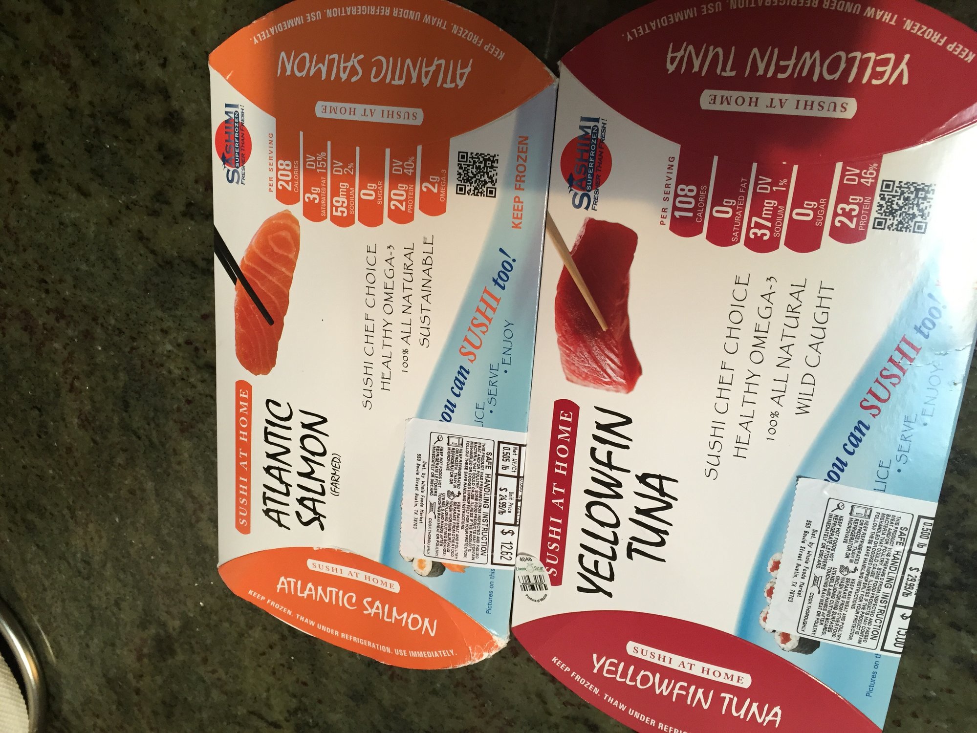 Tuna and salmon from whole foods. I usually buy at local fish peddler but I wanted to give this a try. Takes a while to defrost but it was worth it.