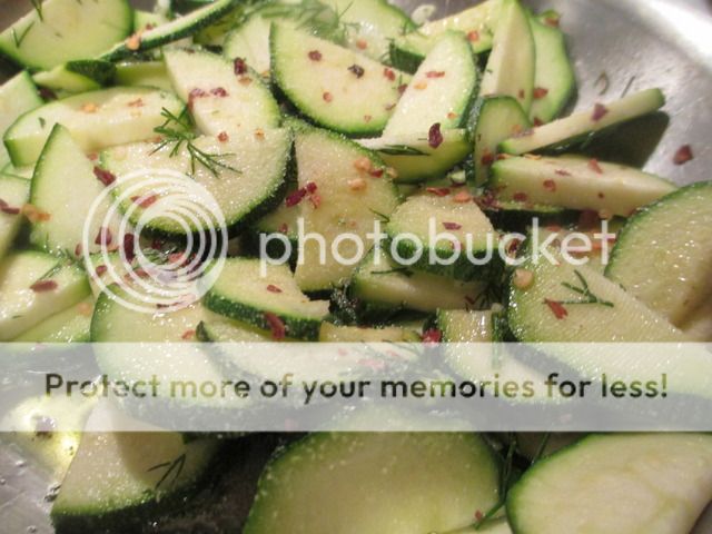 usually when I have zucchini I grill & it serve it as a side but thought why not a deep dish topping, it's been a while. Sliced one up & sauteed it with the dill that was also included along with some garlic, hot pepper flakes, salt & pepper: