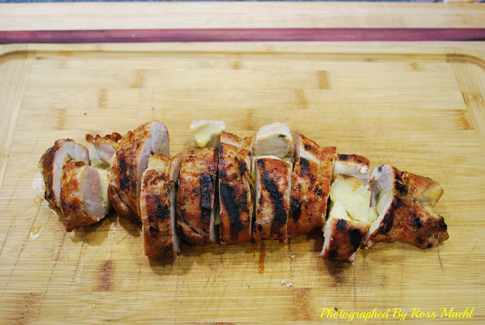 Stuffed with apple slices and cheddar cheese then tied.
