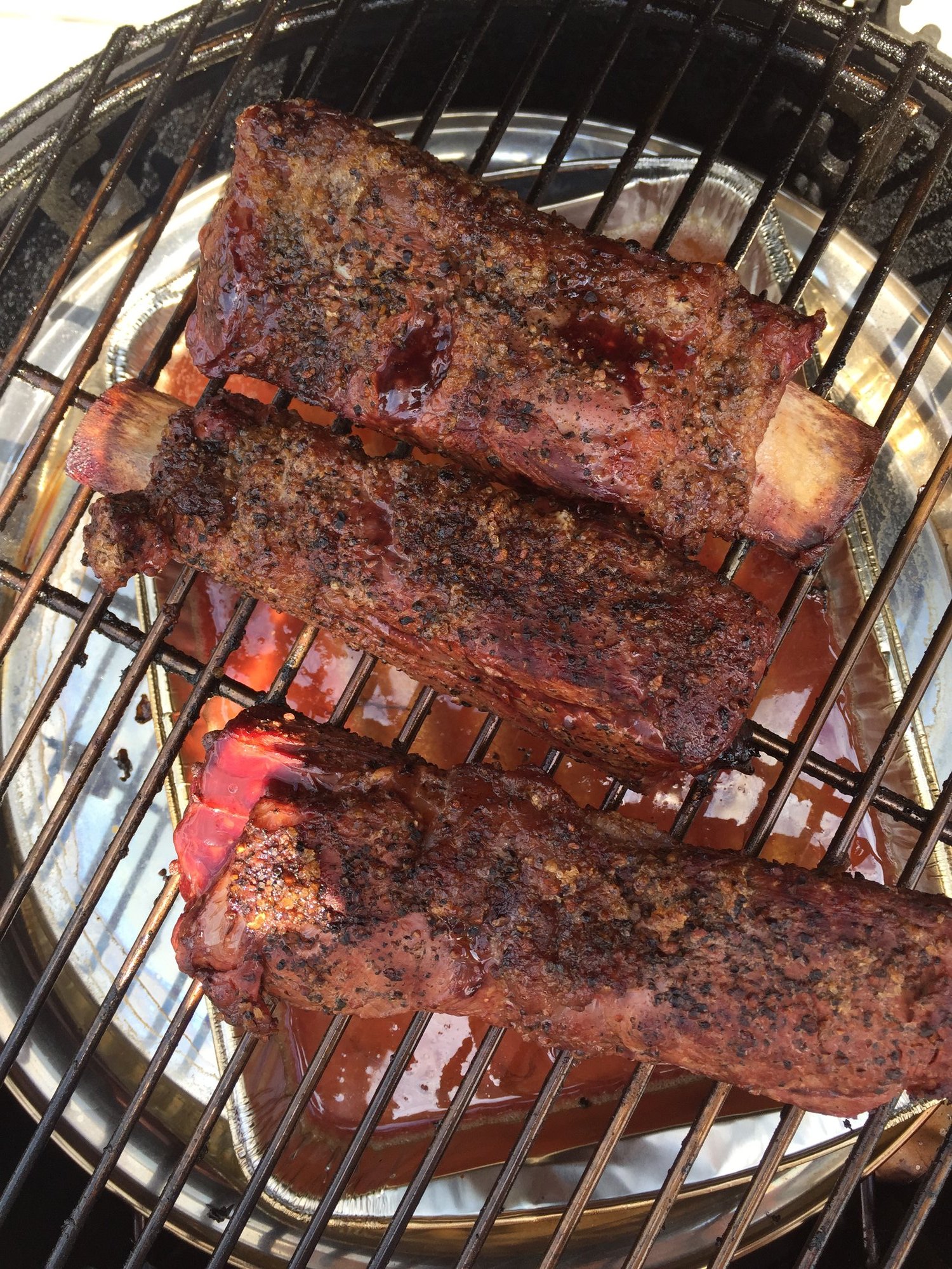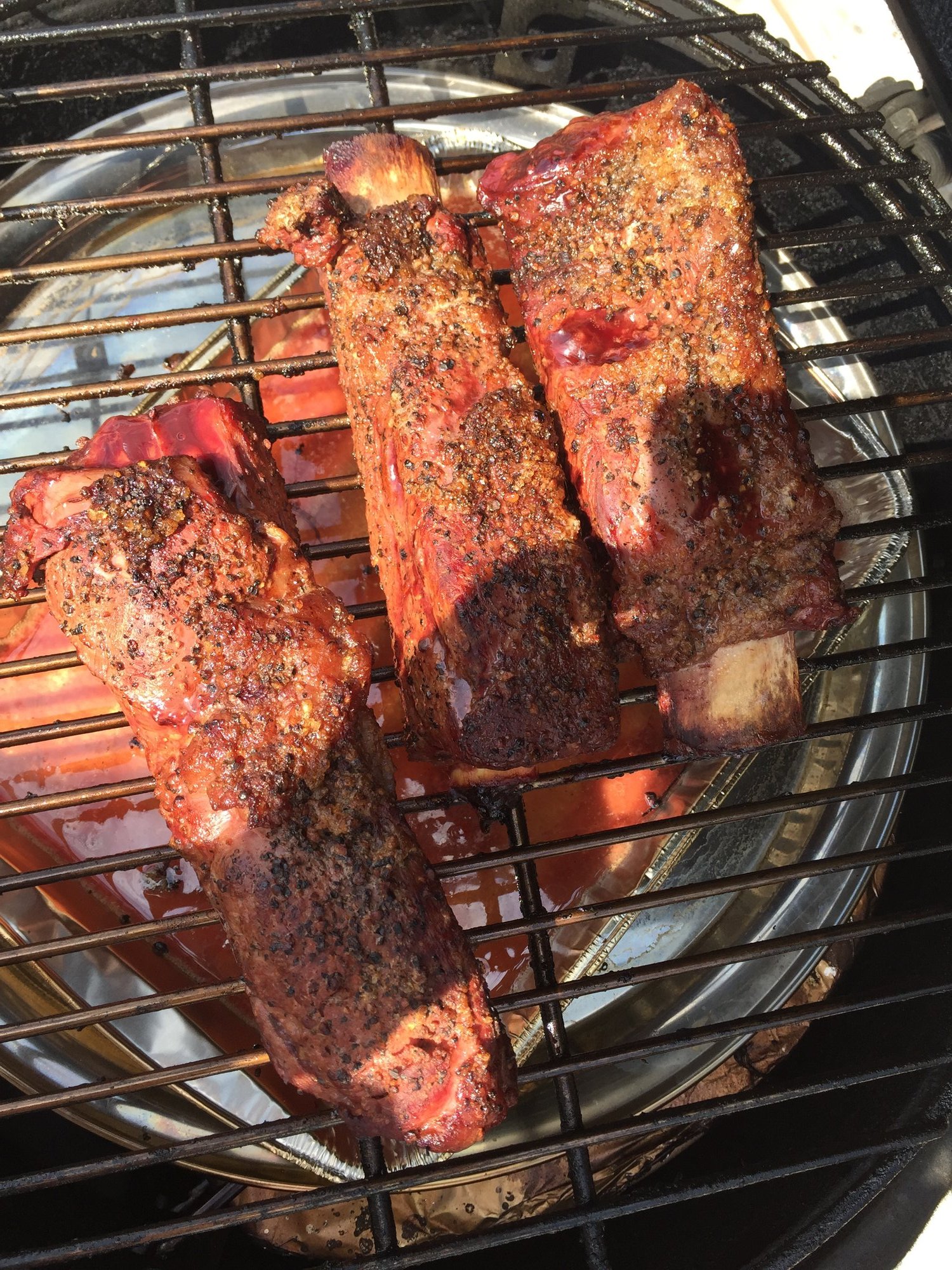 Had these three ribs vac packed in the freezer.  His method is pretty simple.  Slather with hot sauce, salt and pepper, smoke at 285 for 8-9 hours. Spritz liberally. Feels to me that these might be done sooner.  These pictures are a little under two hours in.  Indirect on AR.  He says to use a water pan, which is what you see below.  Wonder if it is really necessary on the Egg.  I am using a combo of hickory and cherry.