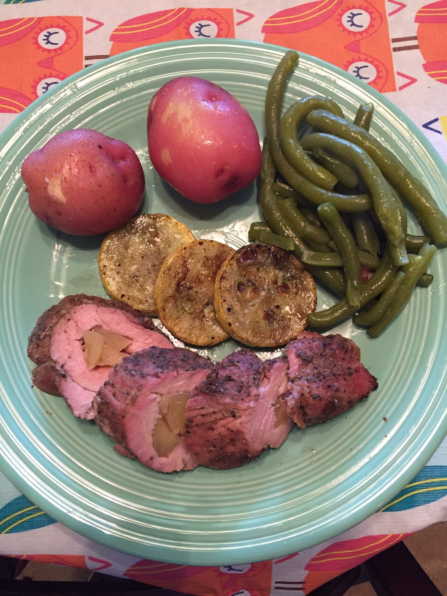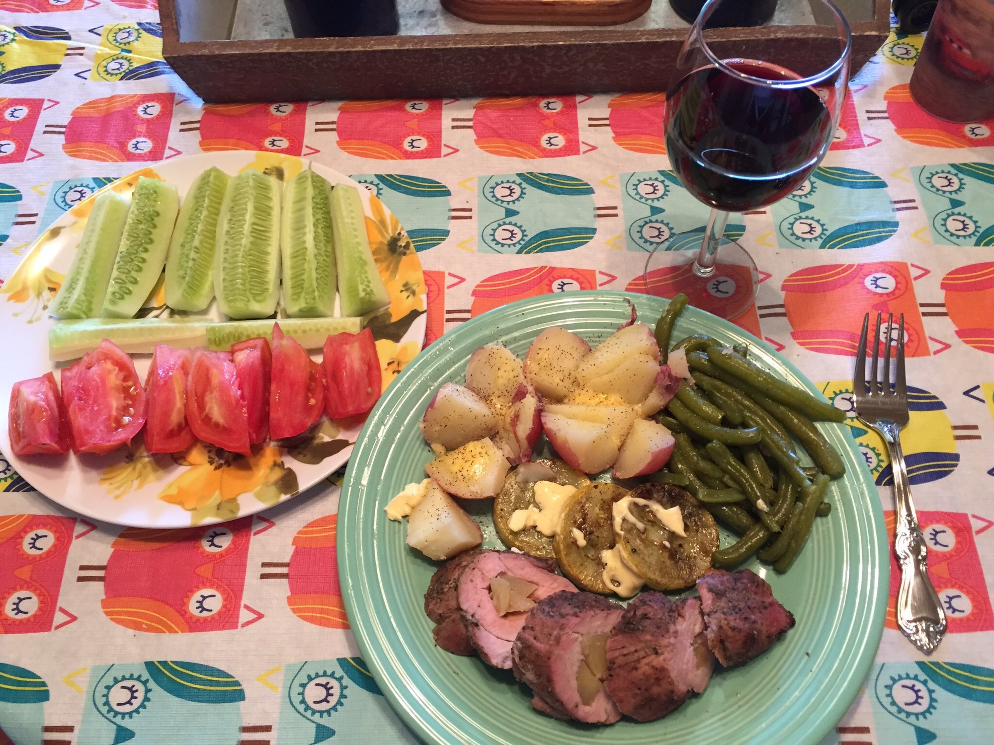 Apple filled Pork Loin with straight from the garden new potatoes, green beans, squash, tomatoes and cucumbers. Great Sunday evening Egg Meal paired with a nice Pinot Noir.