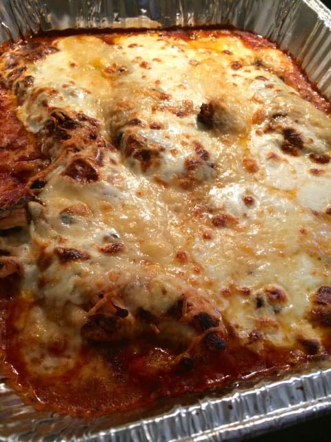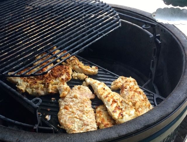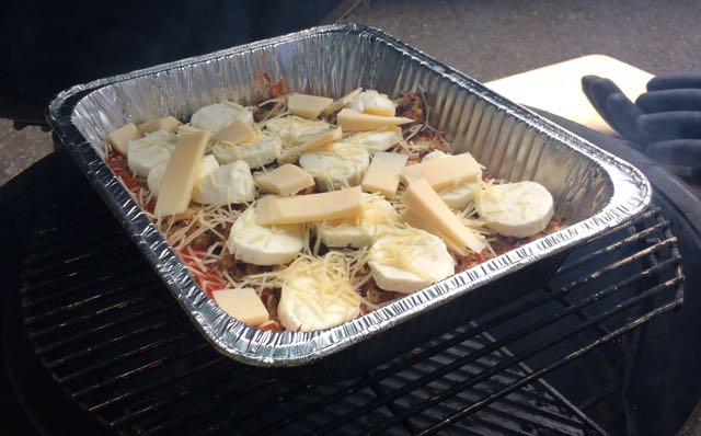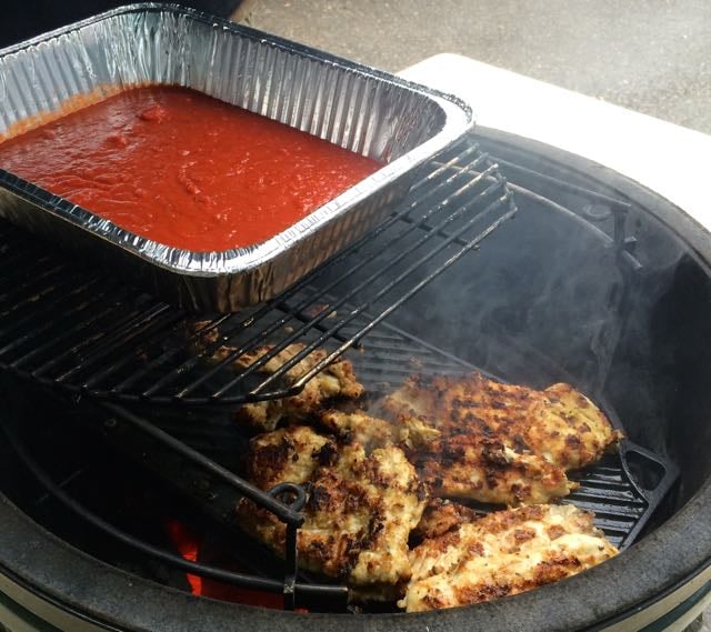 The egg, in the meantime, was up to 450 or so dome with the Lodge LDP3 Double Play Reversible Grill/Griddle set on the half fire ring and a grate up high on the adjustable rig. Poured a little canola oil on the Lodge Grill and cooked the chicken till dark brown, crisp and 170 internal per Thermapen. Then removed the chicken to a disposable foil pan with a jar of Paul Newman marinara in it Topped the chicken with fresh mozzarella, provolone slices and shredded parmesan. Closed the dome (400 or so) for half an hour and then put the whole thing under the broiler inside for a couple minutes to toast the cheese on top.