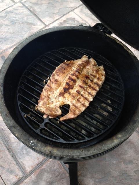 Sunday night, I butterflied a pork tenderloin ( not real pretty), dusted with DP Raging river, grilled direct on the CI Grill. 3-4 minutes on each side, then I went to raised direct and basted with an Asian BBQ sauce. Sliced across the grain and served with some grape sized potatoes and a salad. Came out really good and tender.